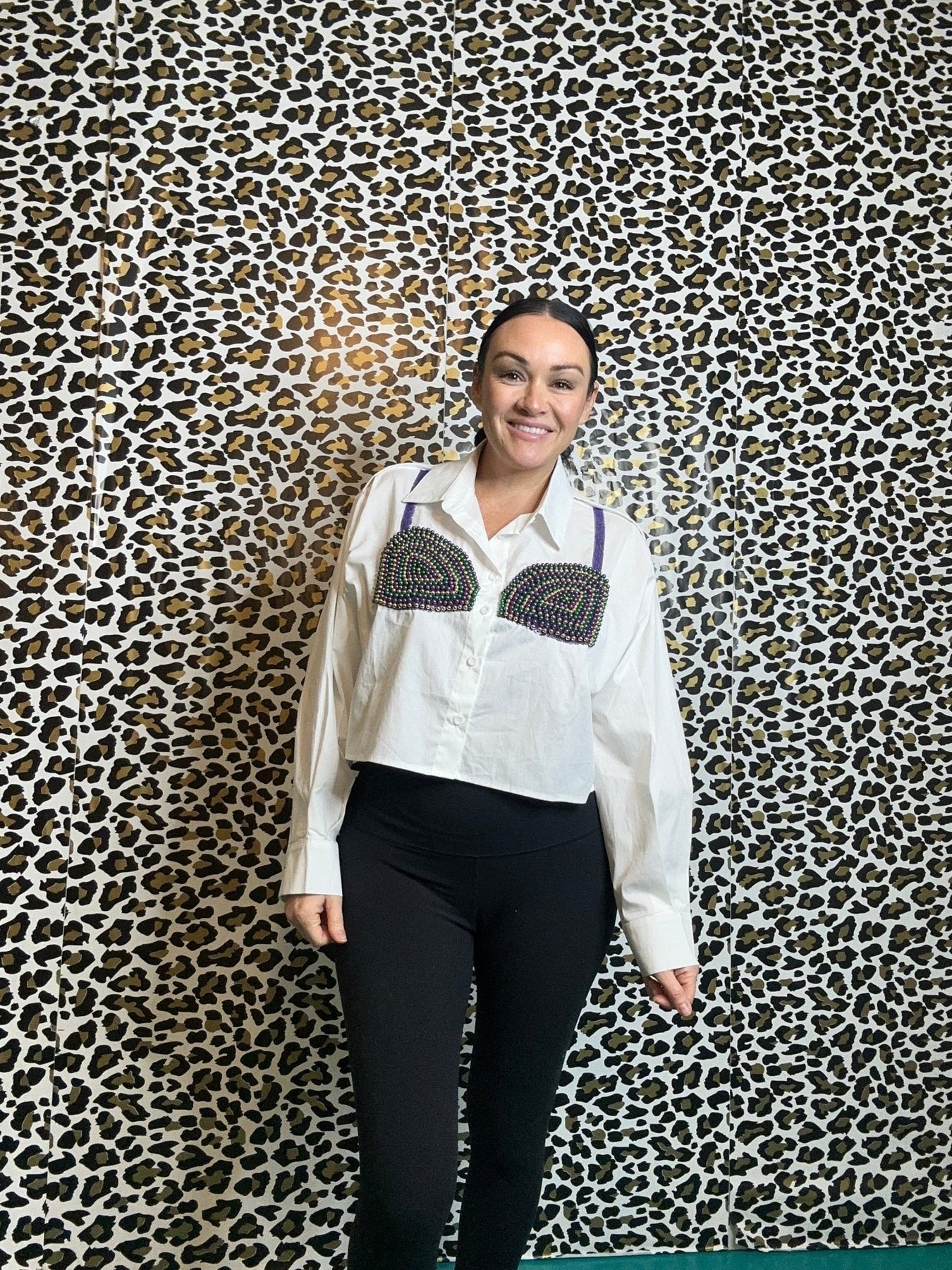 Get ready to rule the party scene with our Queen of Sparkles White Mardi Gras Beaded Bikini Button Up Cotton Top! Sparkle and shine in this unique top, featuring beaded detailing and a playful button-up design. You'll be the life of the party and the queen of style!