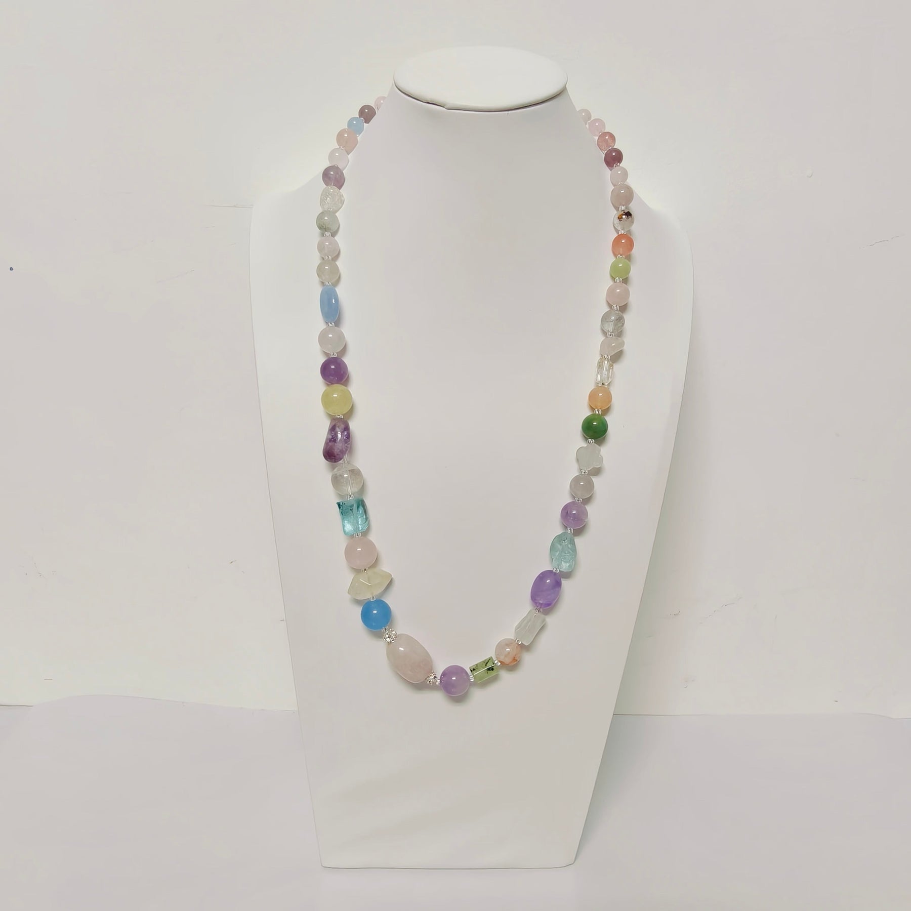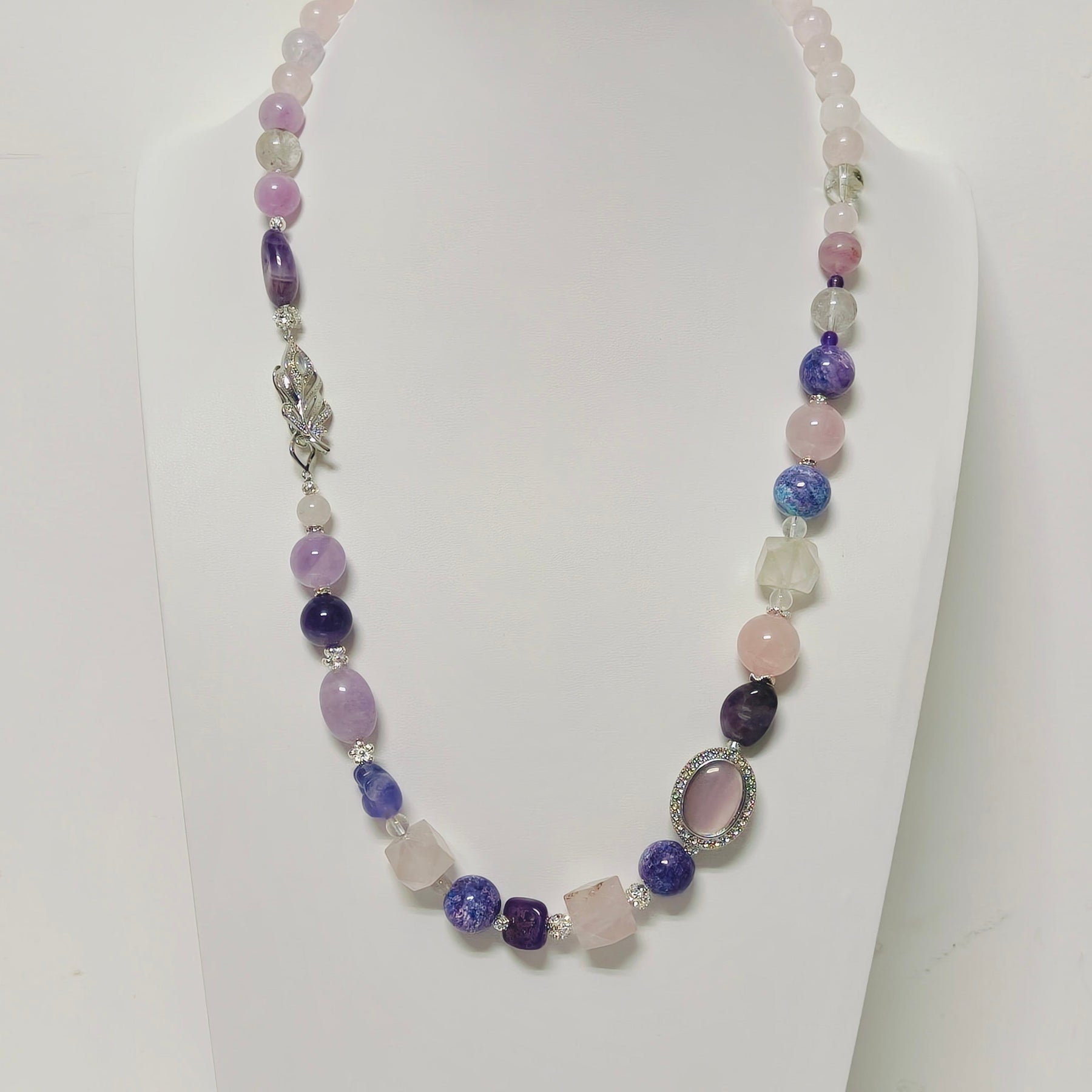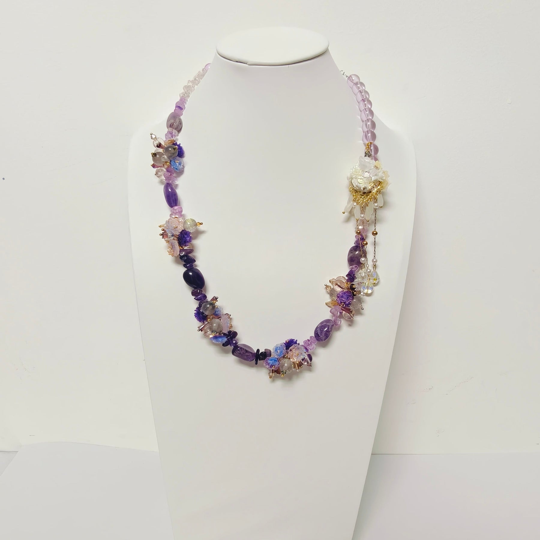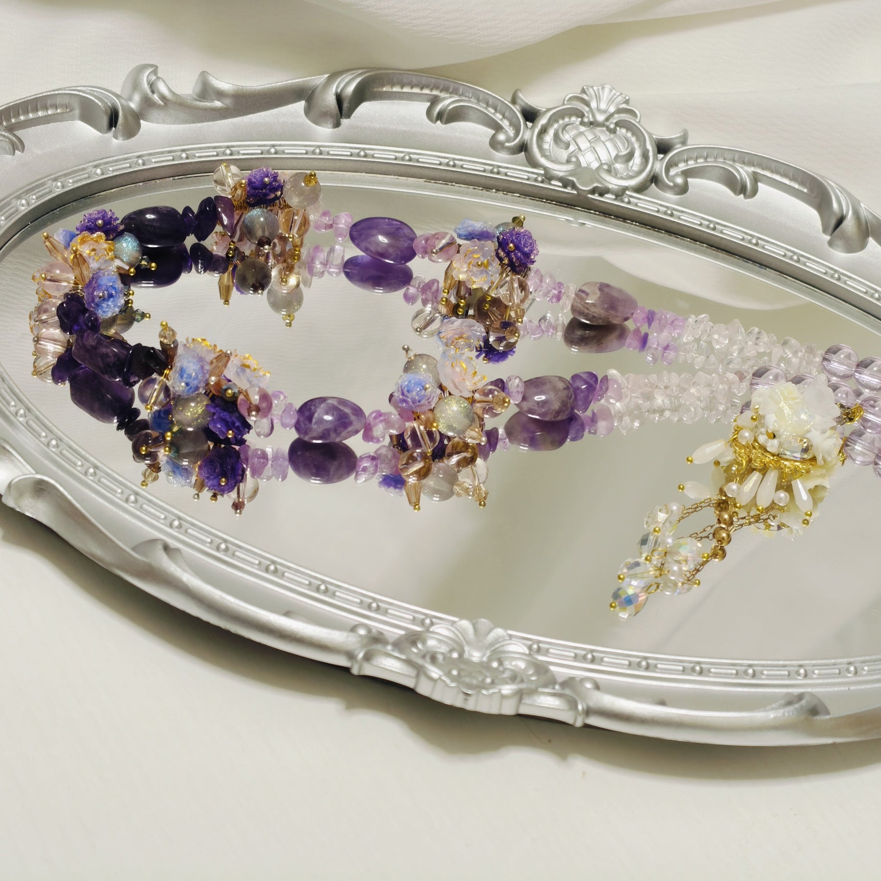 This necklace is entirely handwoven, with each section thoughtfully arranged to highlight the natural sparkle of the crystals and the metallic glow of the alloy components. The combination of faceted crystal beads and elegant alloy ornaments adds a sophisticated contrast, resulting in a piece that feels both modern and timeless.