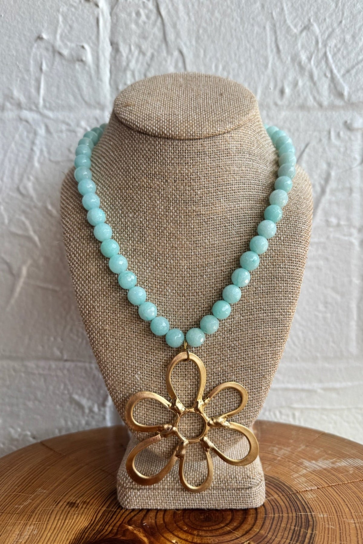 Fresh, playful, and full of charm—the Abstract Daisy Necklace in Mint is a dreamy take on retro florals. Made with glossy 10mm mint gemstone beads and finished with an oversized open gold daisy pendant, this piece brings effortless joy to every outfit.