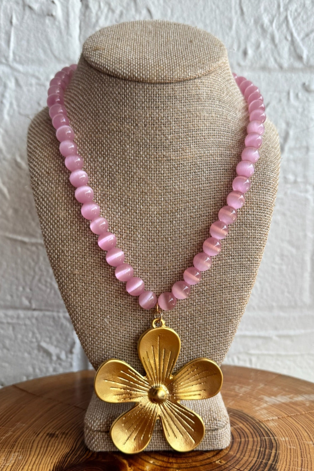 She’s giving flower power, but make it polished. The Retro Daisy Necklace in Blush Cat Eye is a bold nod to vintage style with its oversized golden daisy pendant paired with glossy pink gemstone beads. It’s a mood-lifting piece that adds instant charm—whether layered or worn solo.