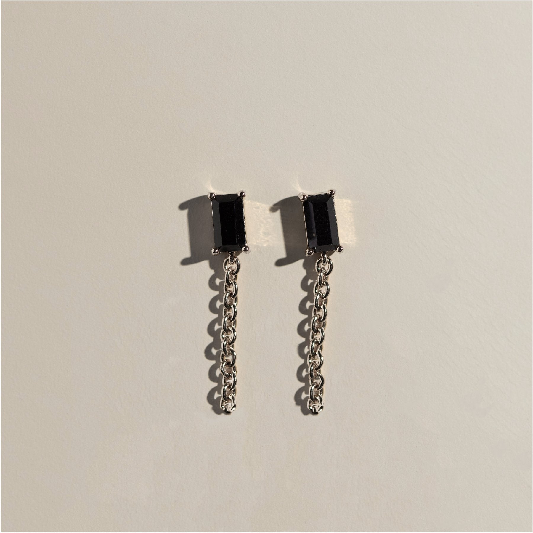 A uniquely elevated approach, our Black Baguette Chain Drop Studs are the perfect pairing to minimalistic outfit to add a layered statement. Featuring a lightweight 14k gold plated chain and baguette emerald cut glass stone giving you the little something extra for your style.
