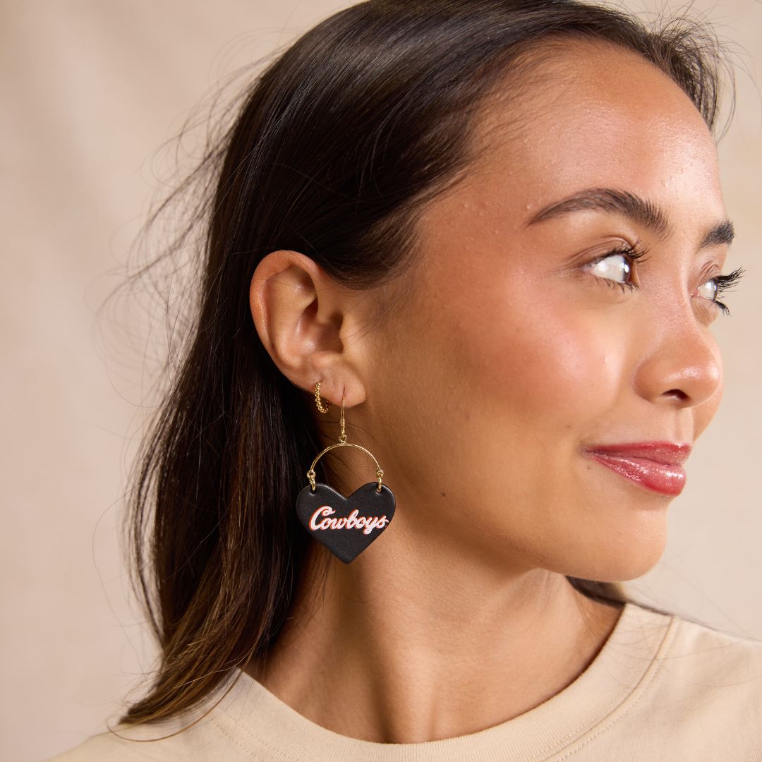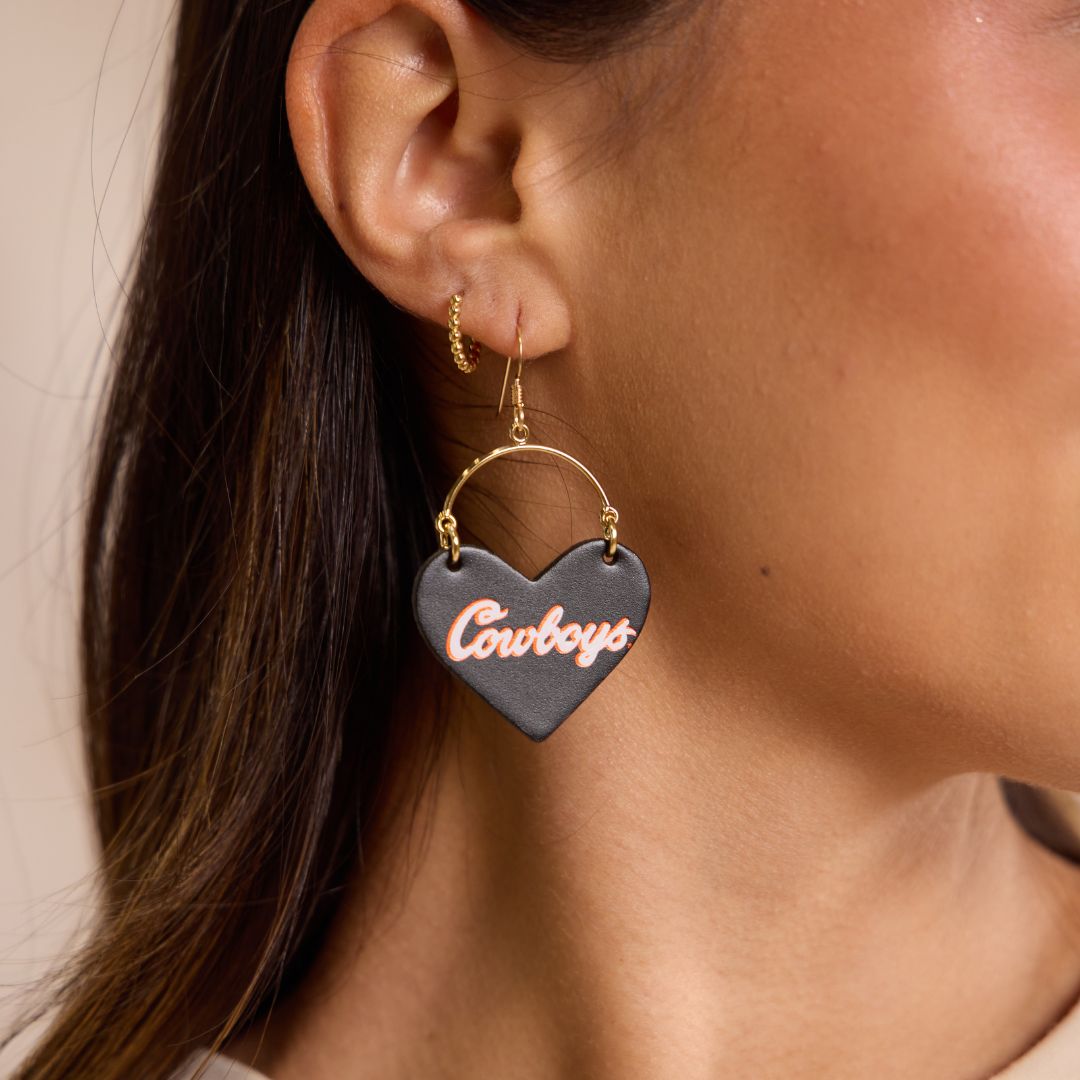 Elevate your gameday look with our Black Oklahoma State University Cowboys Lover leather earrings - the perfect accessory for passionate fans, proud alumni, and stylish students. These officially licensed earrings are crafted and hand-embossed in Kansas City from premium Italian leather for a standout look.