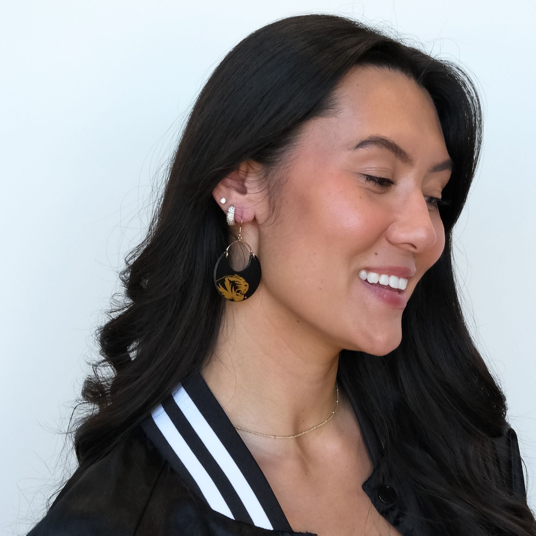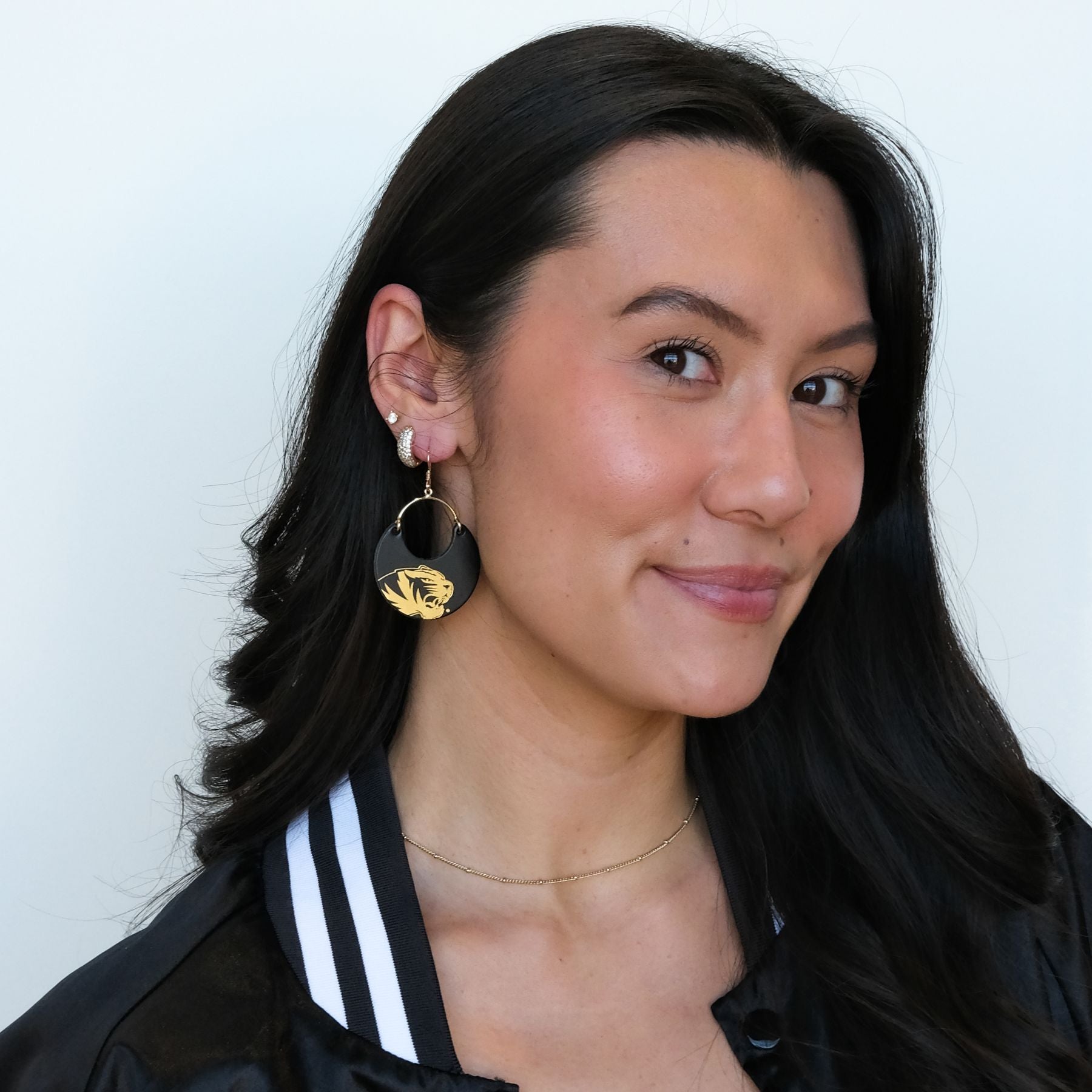 Elevate your game day look with our Black University of Missouri Tiger Ninas. A cute and chic game day earring that's perfect for showing off your team spirit in style. These Black University of Missouri Tiger earrings are perfect for showing off your Tiger pride!
