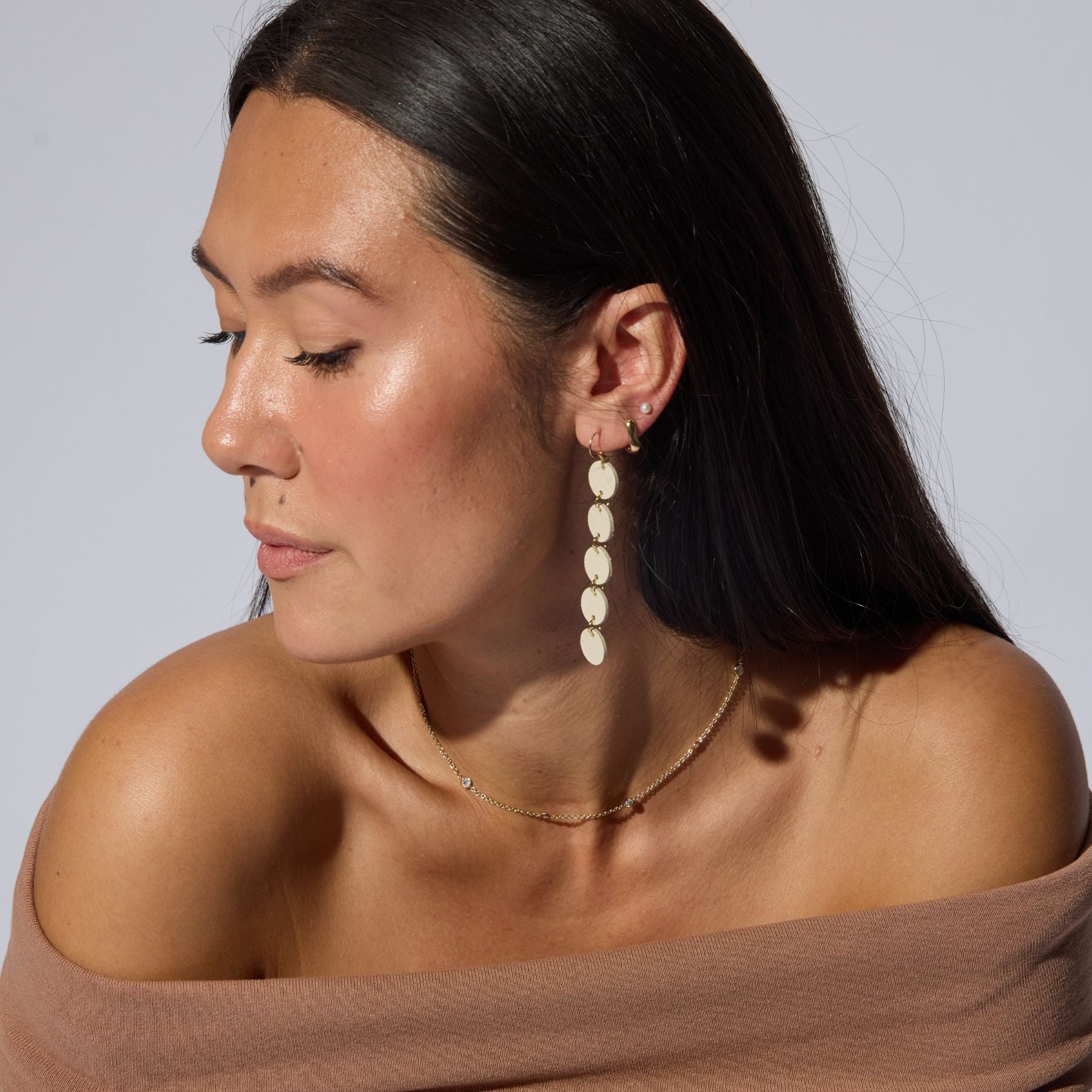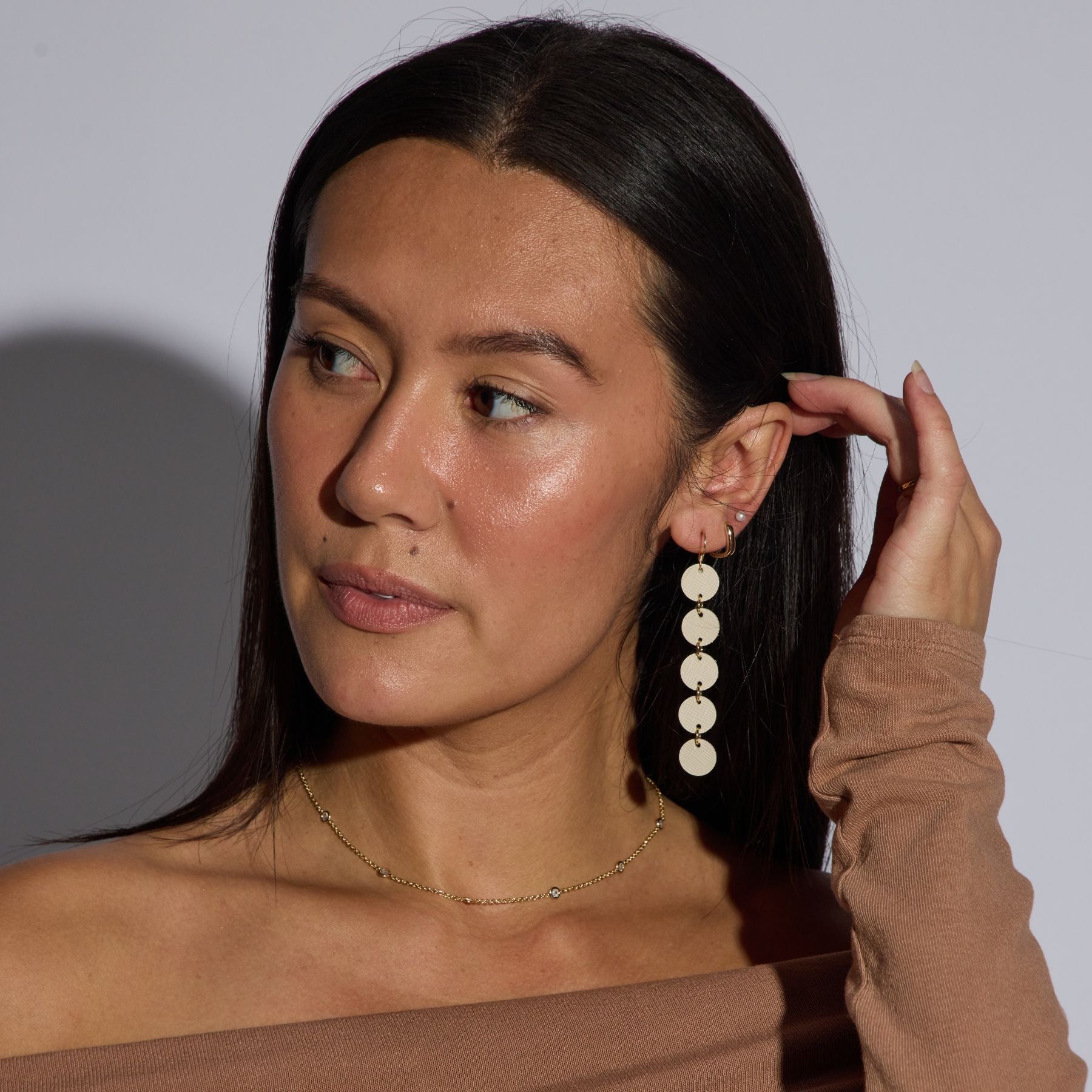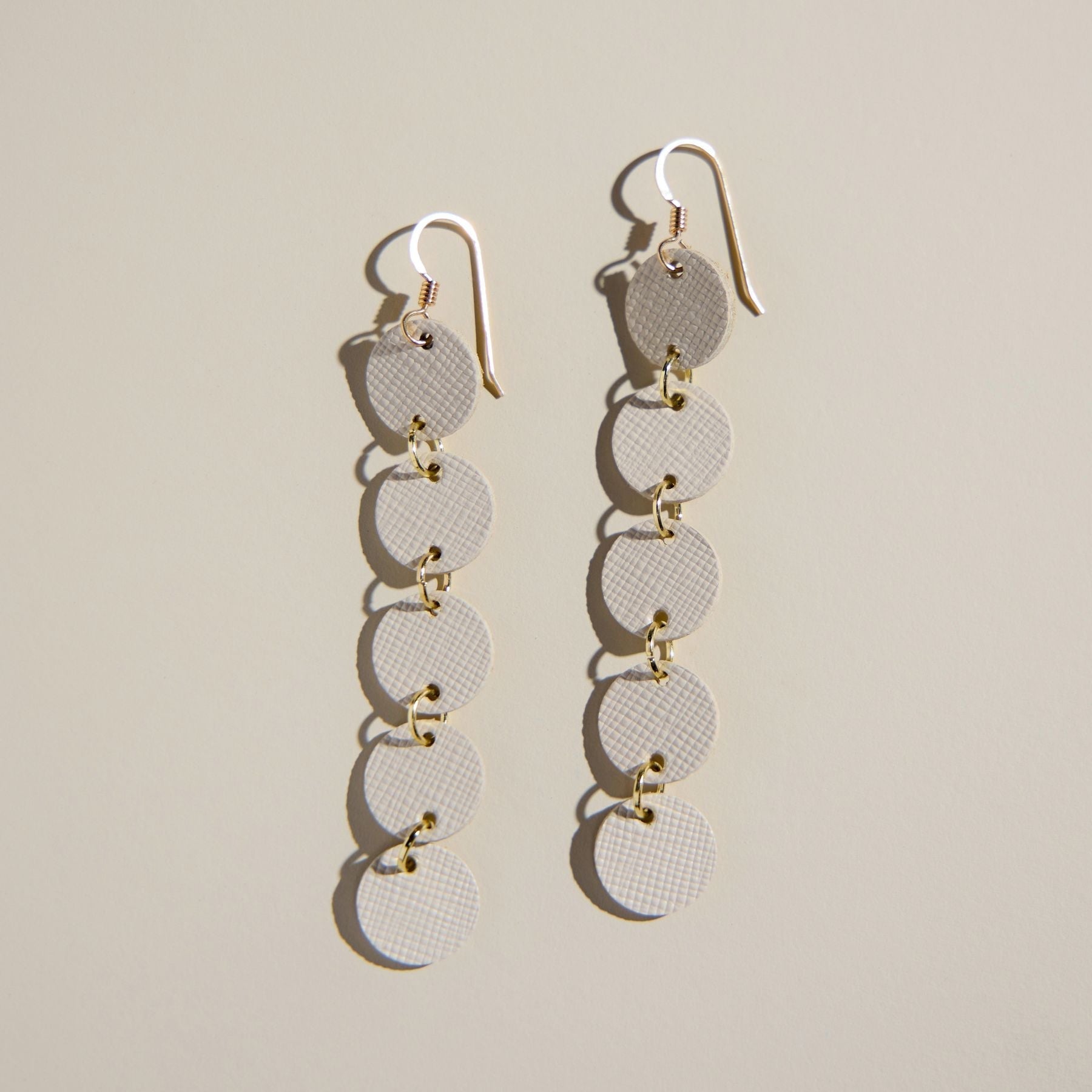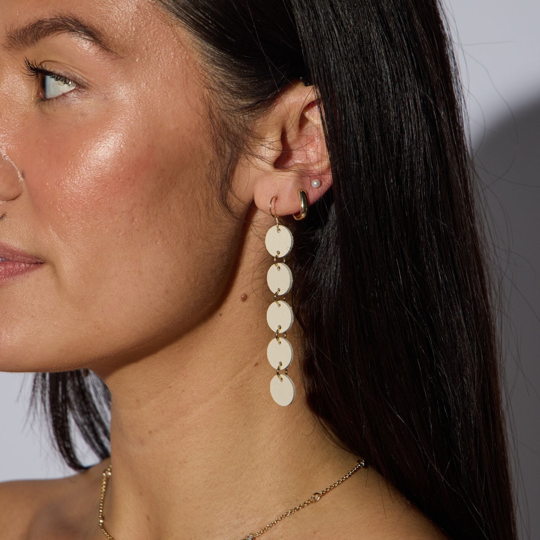 Make Sylvie the star of your style! This playful silhouette is inspired by sequins and crafted with our premium textured Blank Canvas leather to create a dangling drop earring. The neutral leather and 14k gold hardware make this statement earring a lightweight staple.