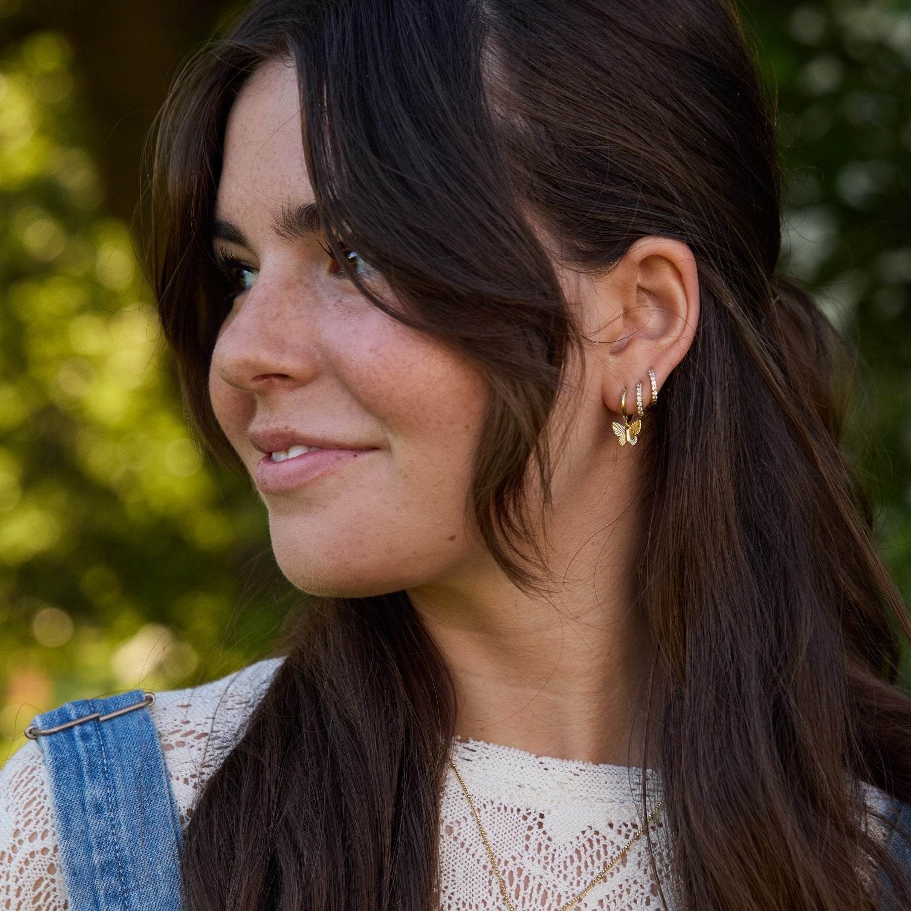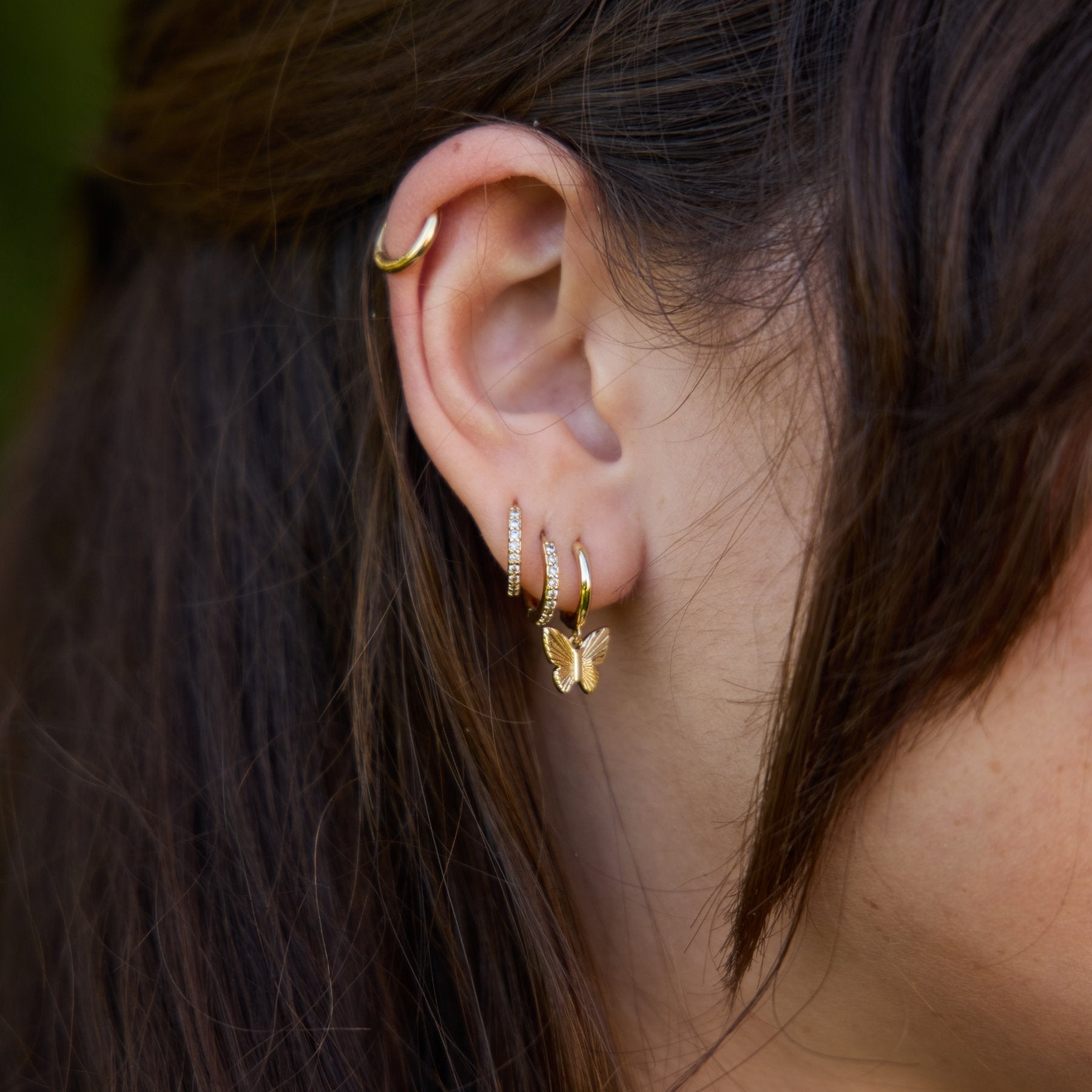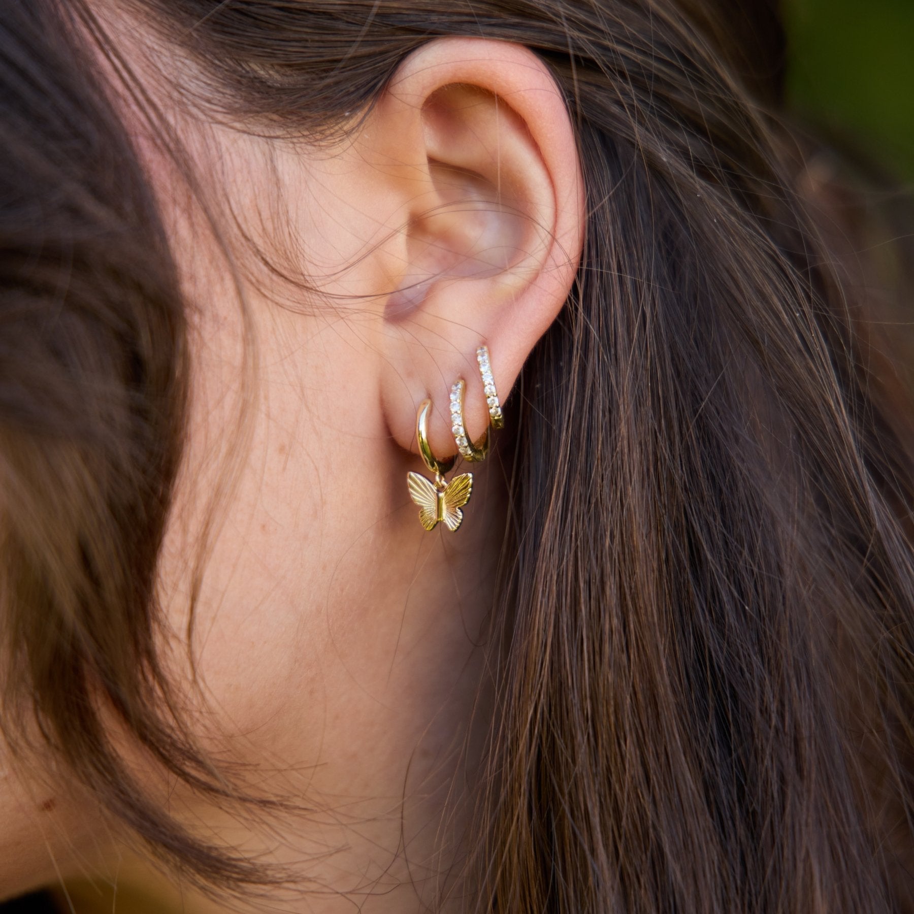 The Butterfly Huggies feature a gold drop butterfly on a gold huggie perfectly delicate and dainty enough for a second or third piercing but shiny enough to stand alone on their own.