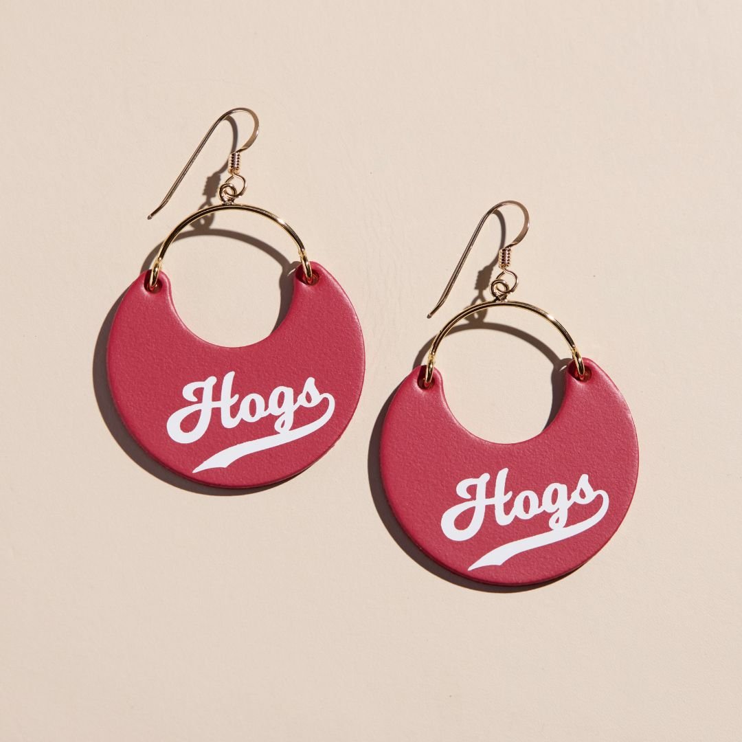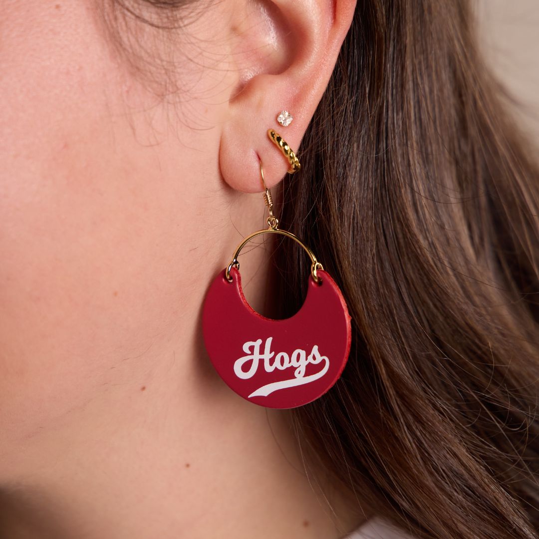 Get ready for gameday with our University of Arkansas Nina leather earrings. This spirited earring is officially licensed and perfect for showing off your team pride. Our earrings are crafted and hand-embossed in Kansas City from premium Italian leather for a standout look.