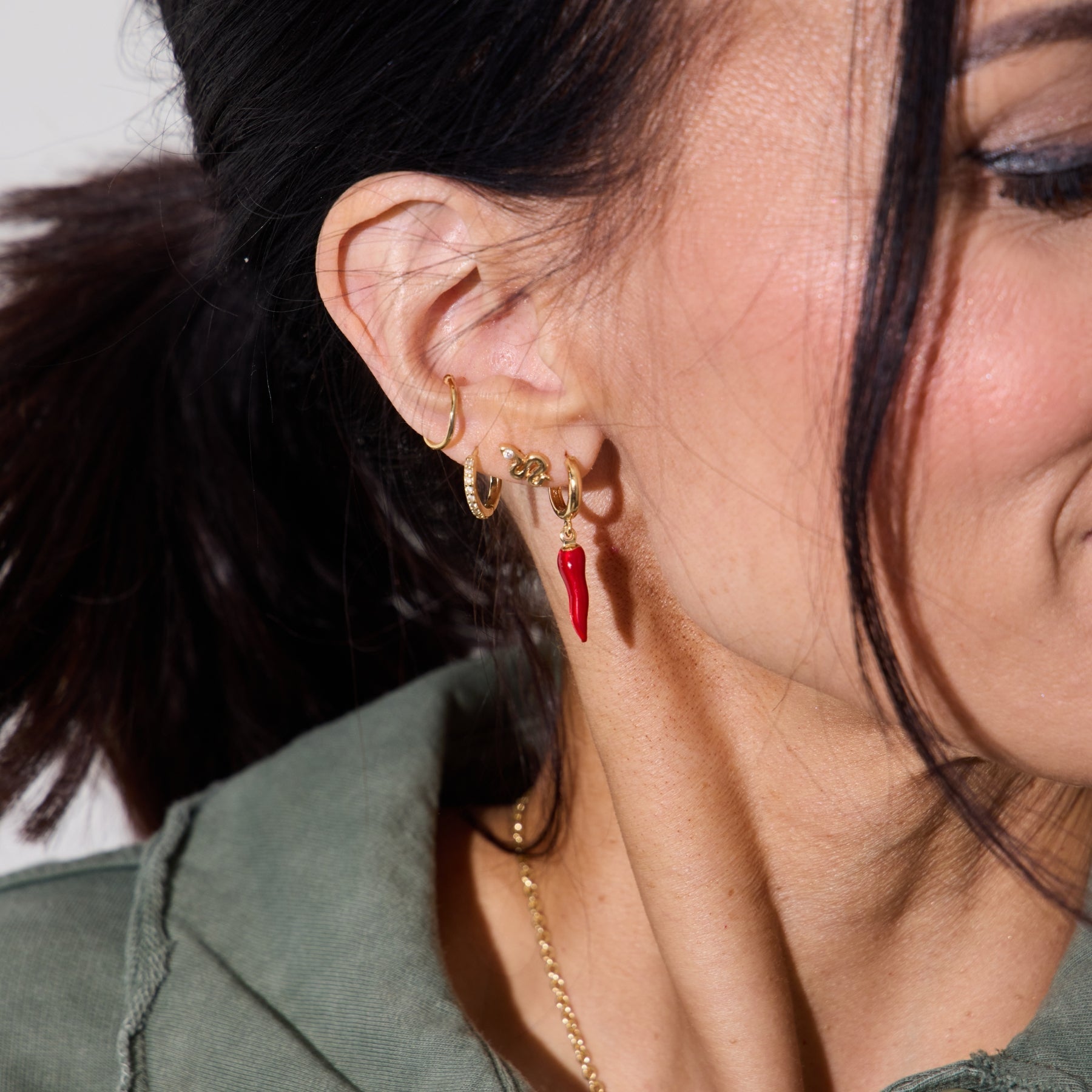 Turn up the heat and add the new Chili Pepper Huggies for an extra bit of 'spice' in your ear stack! Made of 18k gold filled and red enamel, these Chili Pepper Huggies are inspired by the pepper charm in Italy which is known to to have the heat and courage to fight off the evil eye. The pepper charm is supposed to help protect from hurtful gossip of envious tongues, but attracting good fortune to the one who wears it.