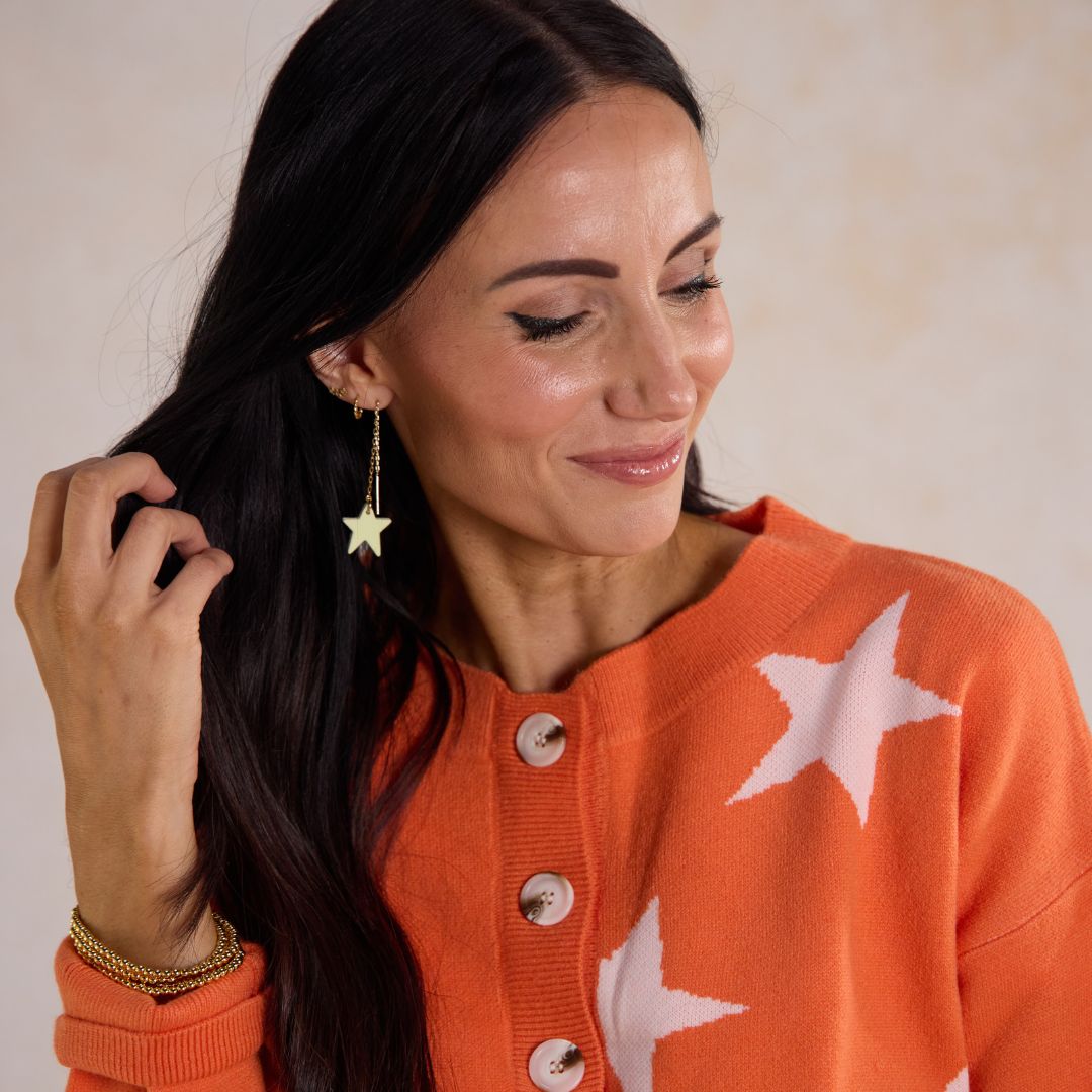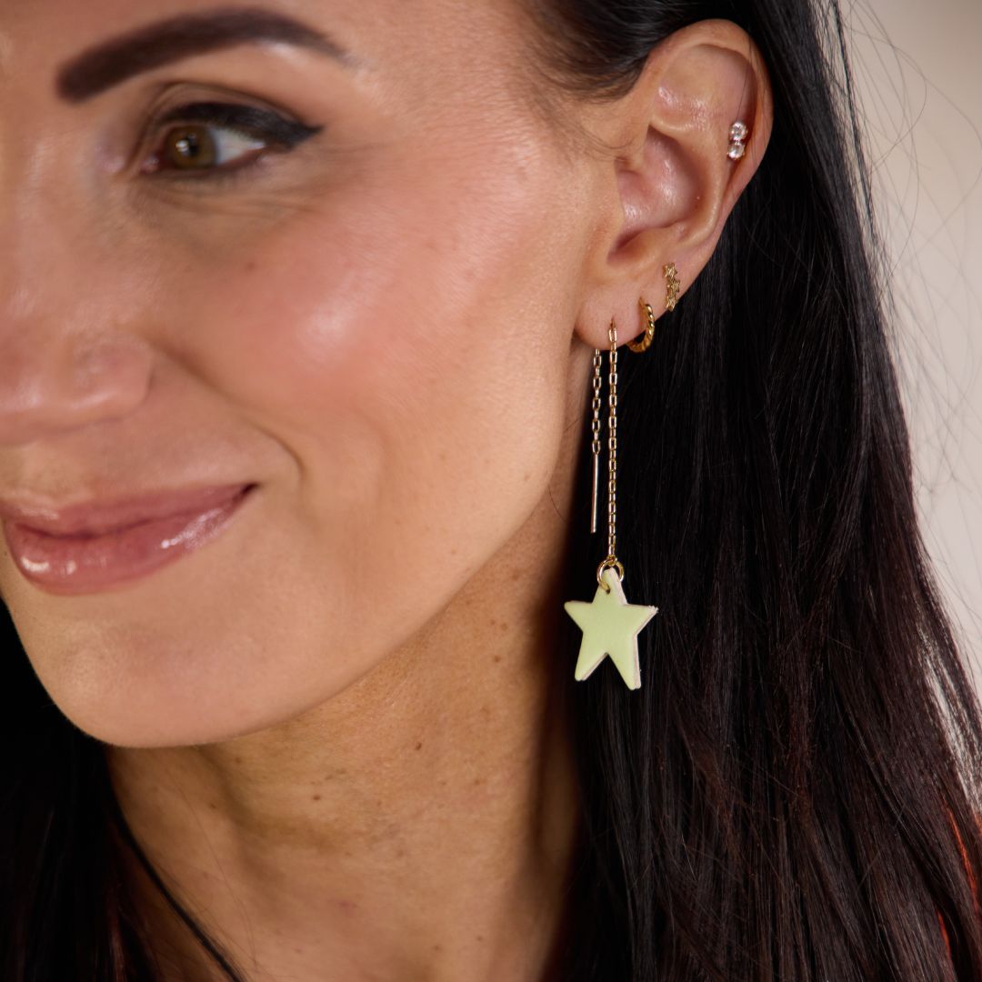 You'll SHINE in these one-of-a-kind threader earrings. This design features a glow in the dark star shaped leather accent attached to this popular 14k gold-plated or rhodium threader earring. Easily thread through any piercing for lightweight, no-slip wear.