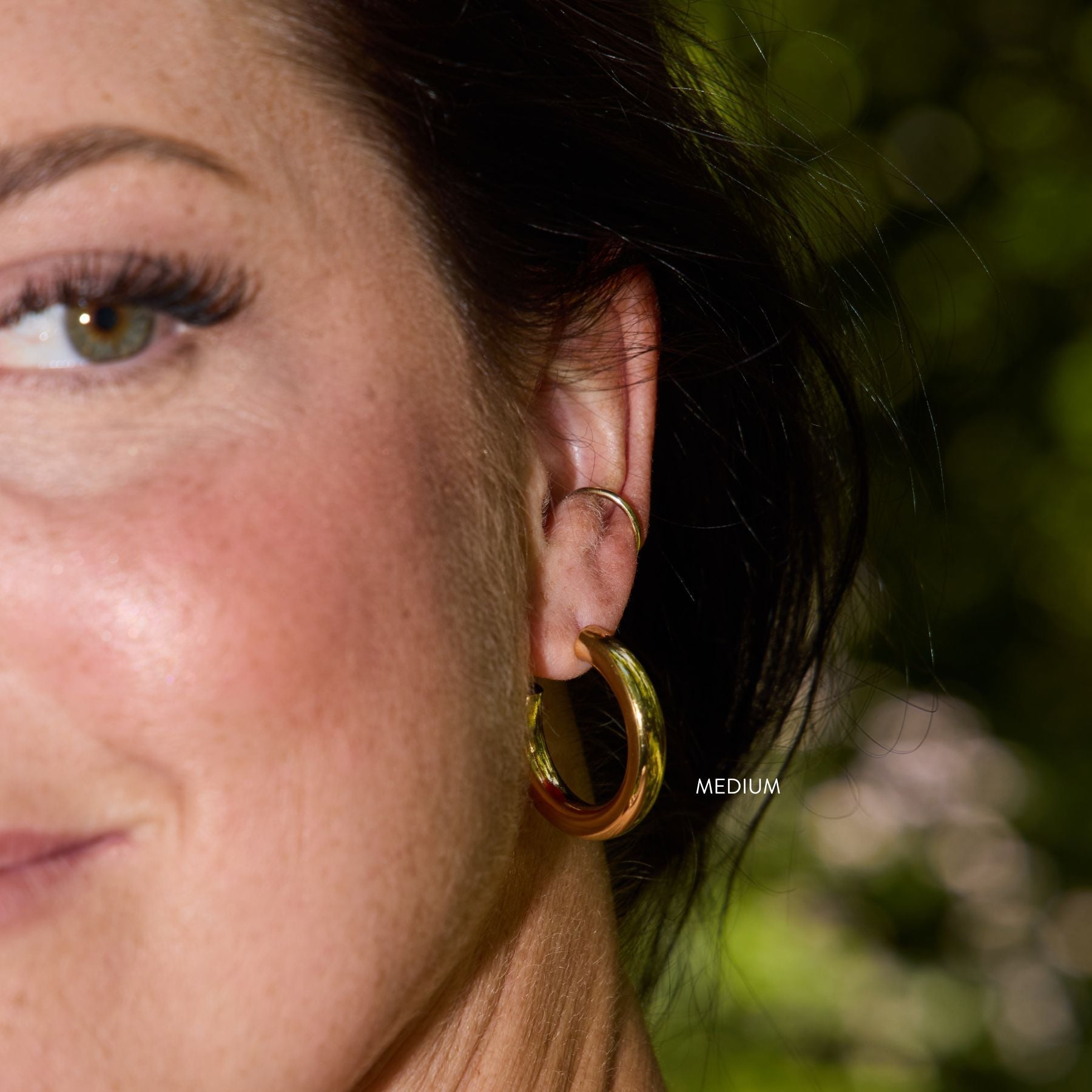 The perfect finishing touch for your look, these 14k gold Gold Hollow Statement Hoops were created for the intention of an internal hollow to lend a light and delicate touch with the appeal of a heavy and bold look. These modern hoops are PVD plated for a waterproof finish, perfect for dressing up or down, and are incredibly lightweight.