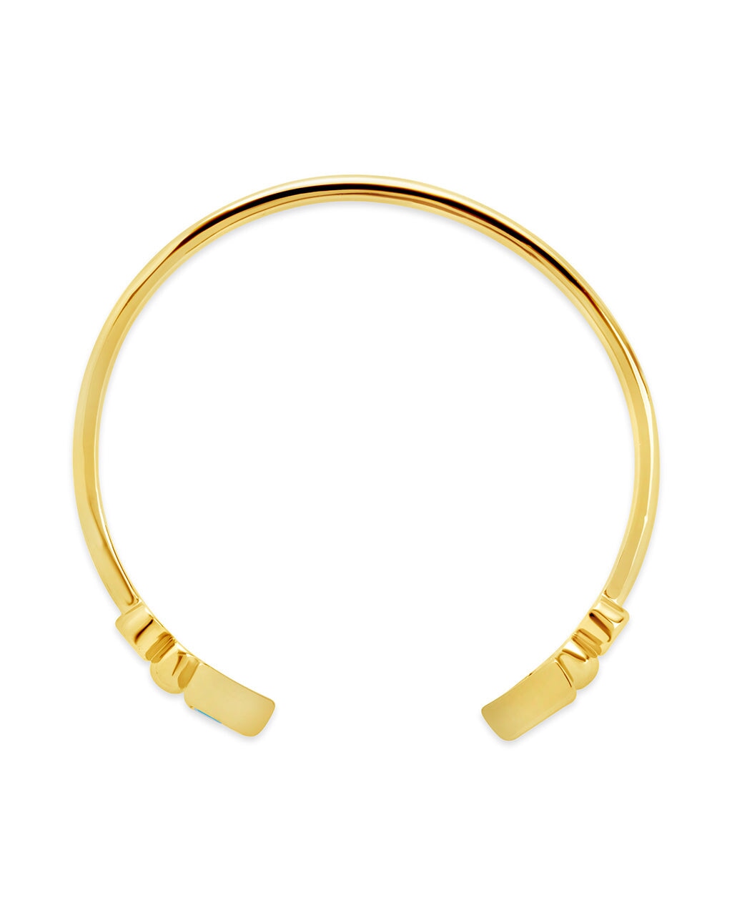 Add the perfect finishing touch to your look with this bold cuff bracelet! It features a pair of round turquoise stones and a pair of pointed turquoise stones. Stack it, mix it, and match it with your other faves.