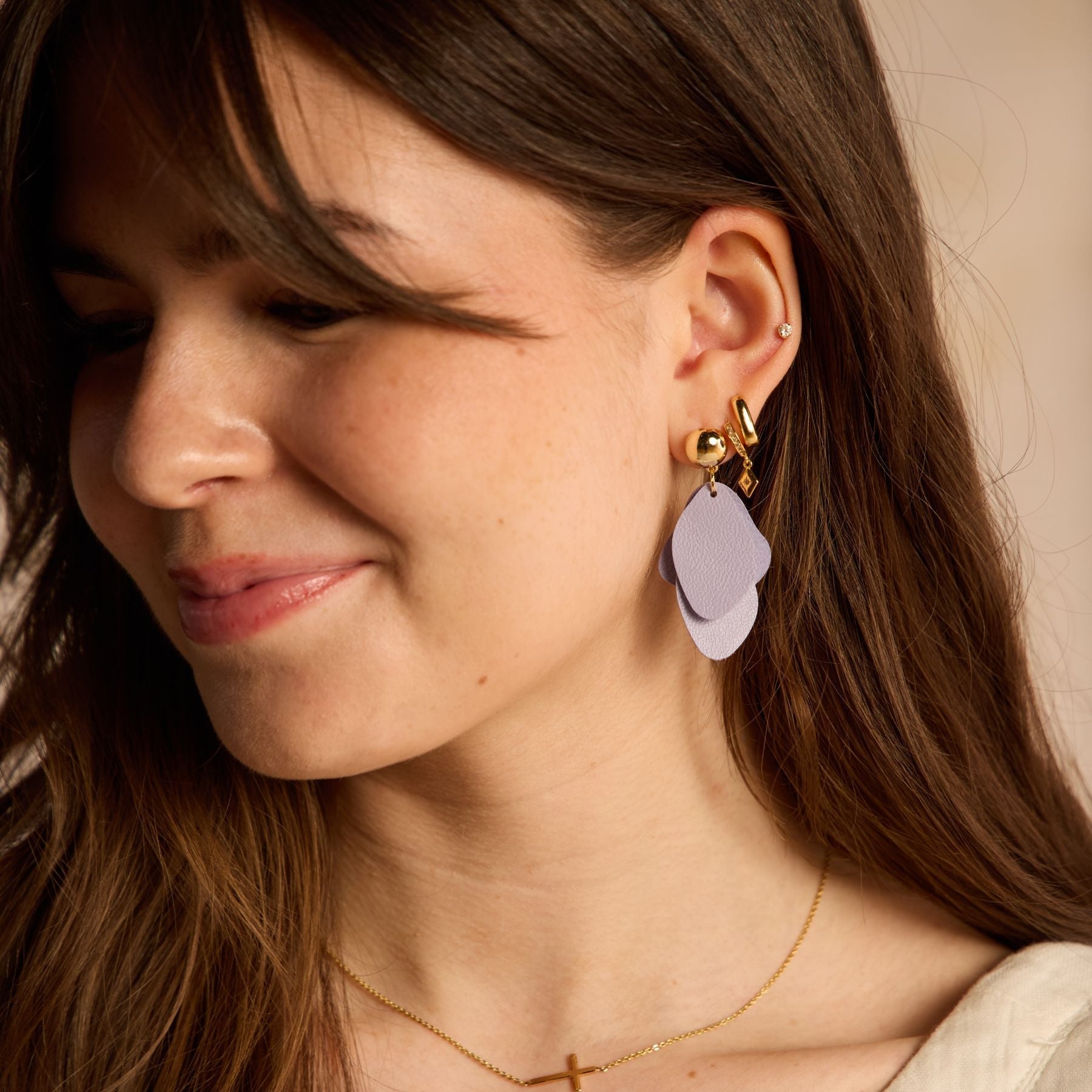 A new take on leather earrings, introducing the Weston. Crafted with soft Lilac Leather and gold or silver stud piece. These statement stud earrings are a one-of-a-kind, free-flowing leather earring, with subtle movement and lightweight design.