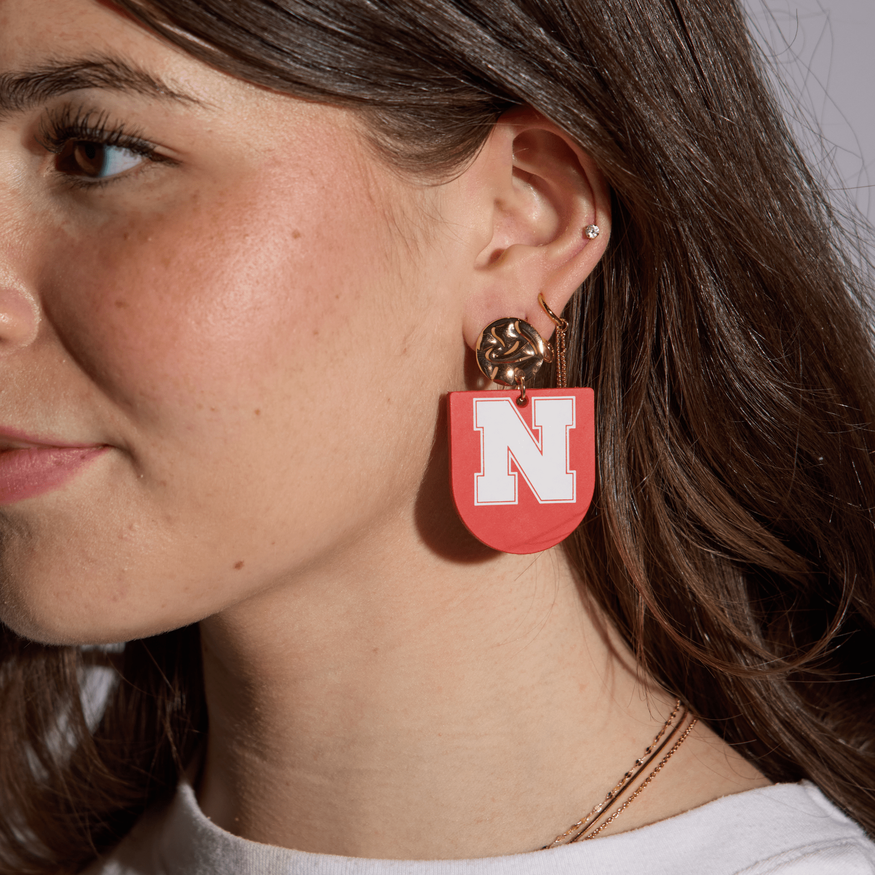 Elevate your game day look with our Red University of Nebraska Harpers. A cute and chic game day earring that's perfect for showing off your Husker team spirit in style. These red and white post earrings are a bold way to show your school spirit.