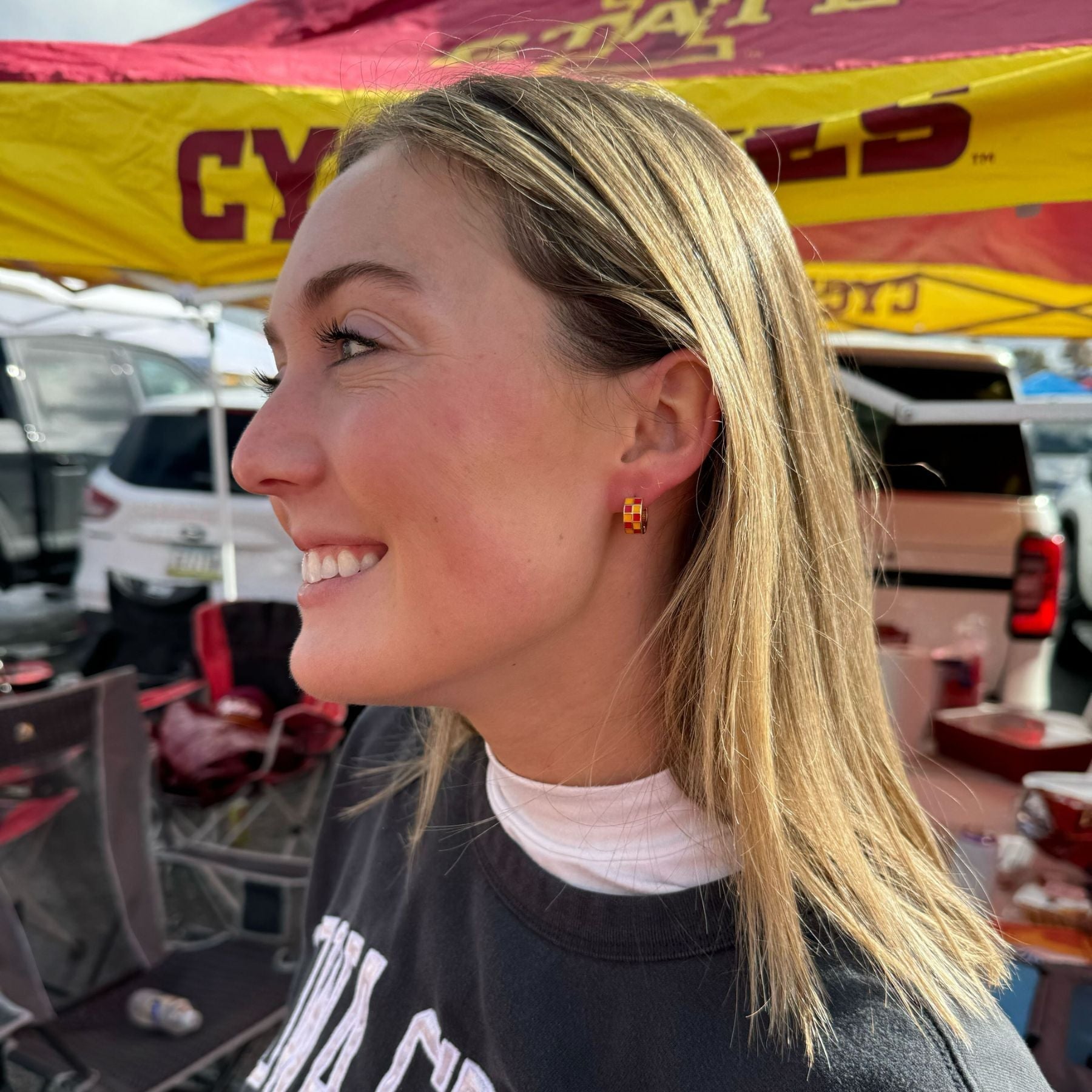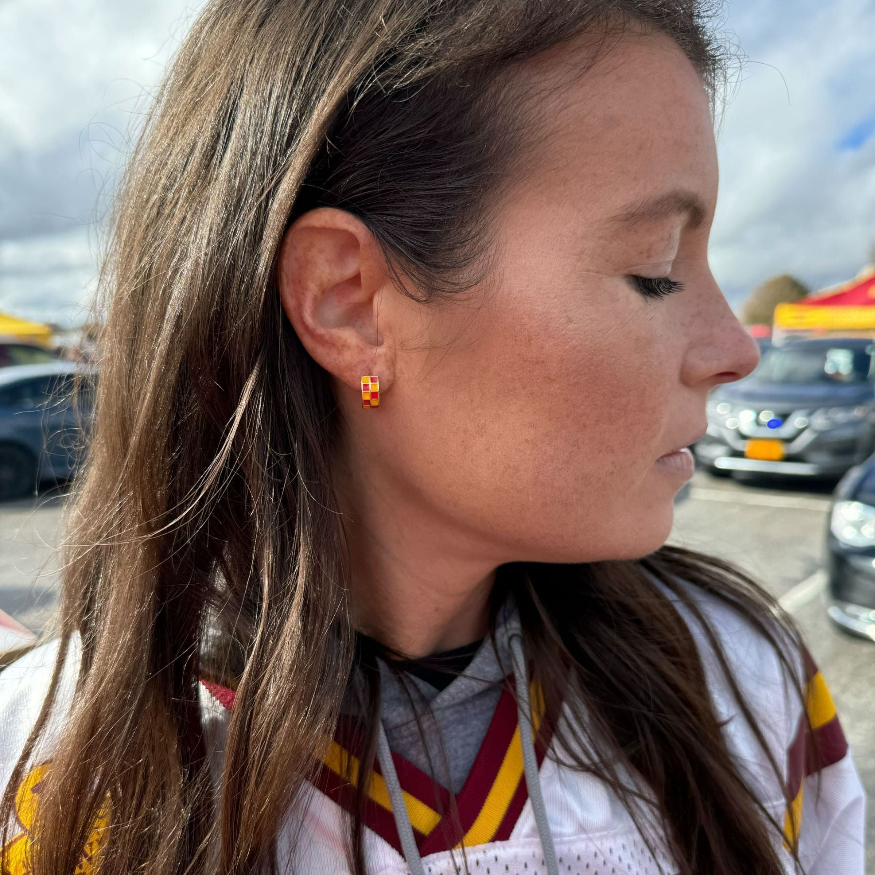 The red and yellow checkered enamel huggies are a wide, small gold hoop with red and yellow enamel that fits closely to the ear. Perfect for gameday or showing your school spirit, they feature a hinge closure for comfort and wearability.