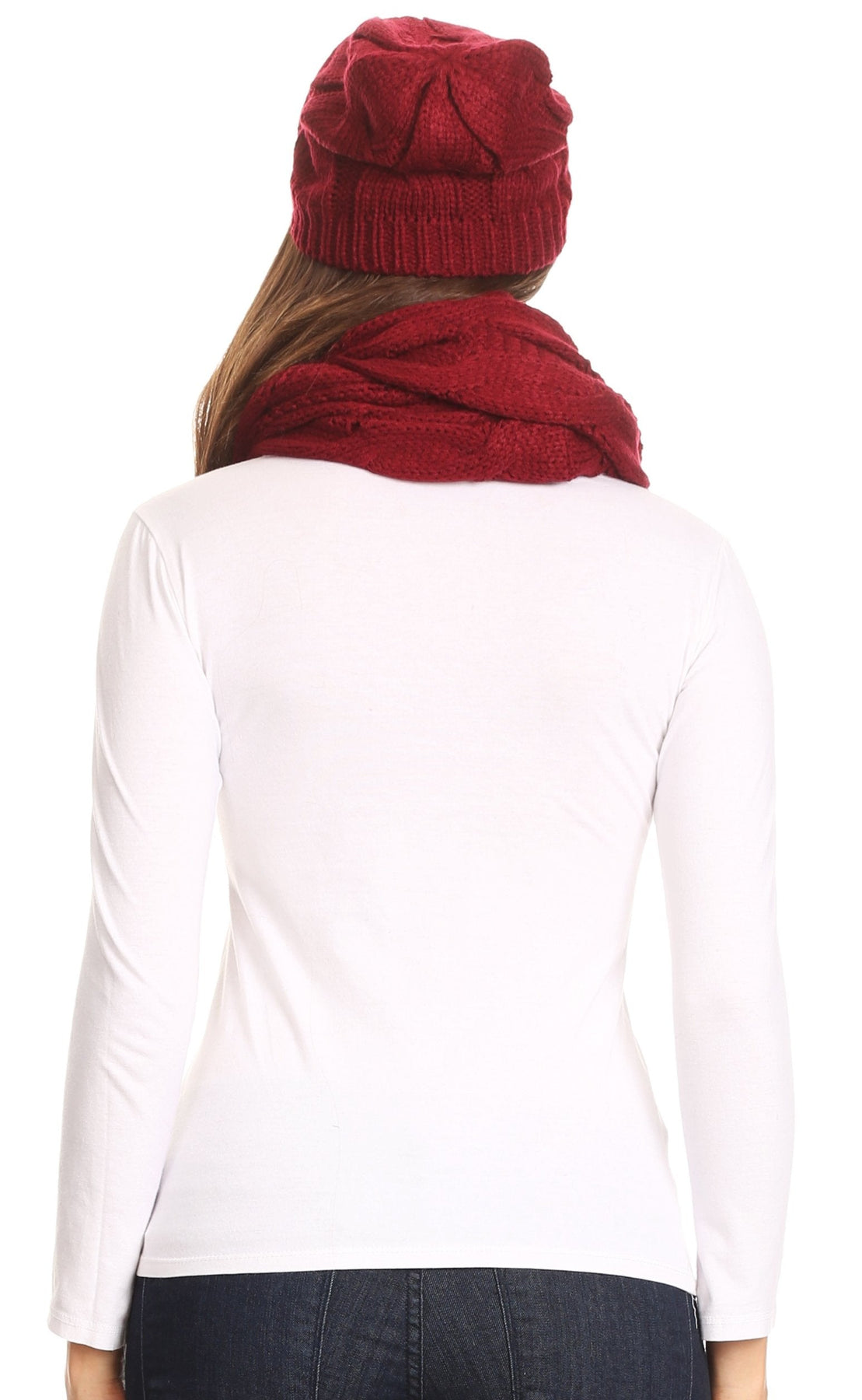 • This scarf and hat set features a matching winter scarf and hat. The scarf is lined on one side with a faux fur designed fabric, and knitted in a cable knit design pattern. The beanie hat is knitted with the same design and color of the scarf, in a cable knit design. The hat is unlined and has plenty of room for stretch. The scarf is an infinity scarf that can be wrapped around the neck for a warm and cozy fit.