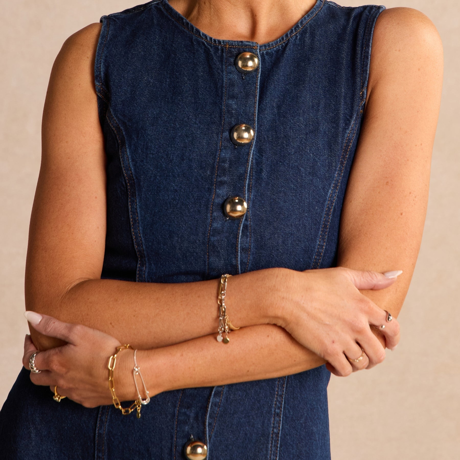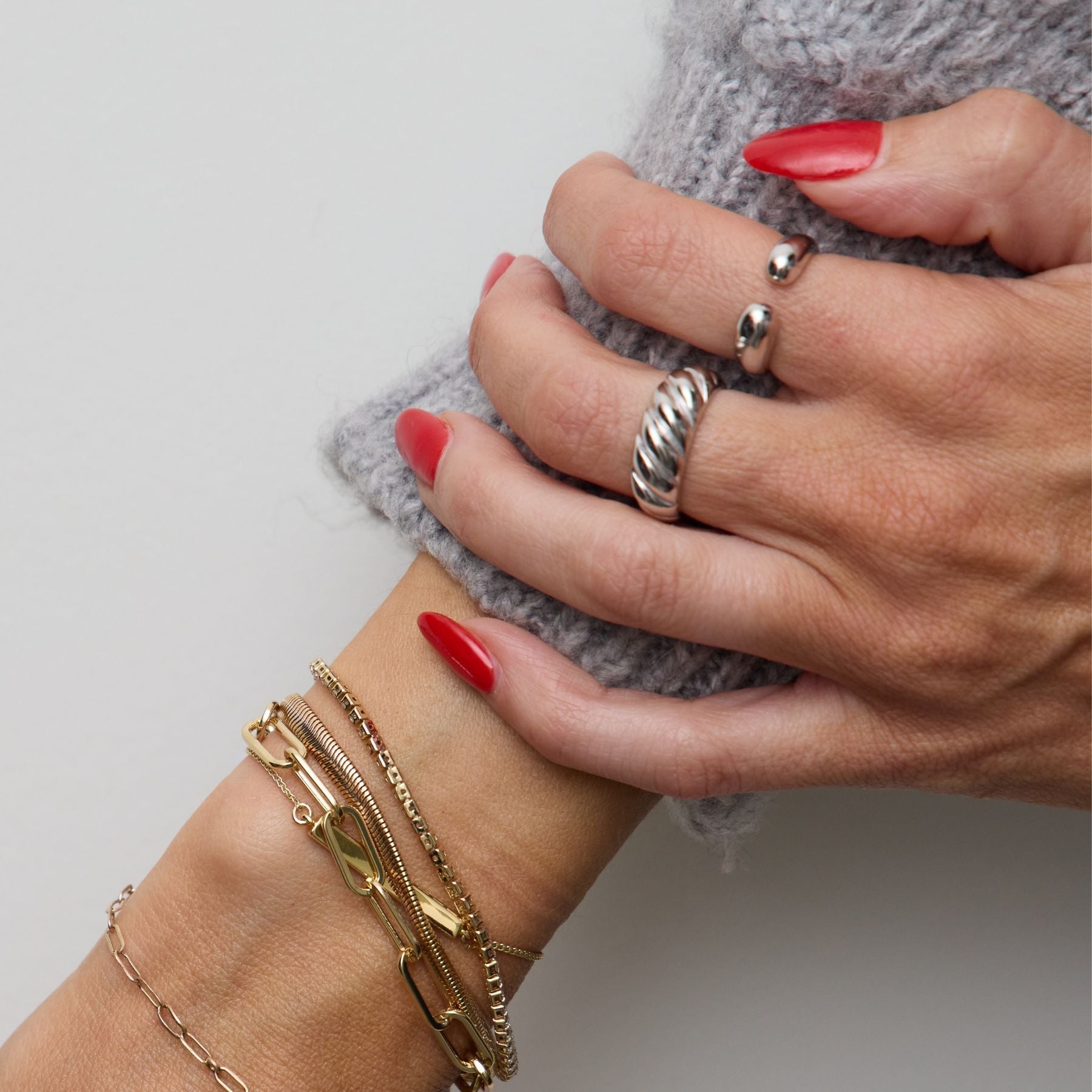 The Double Round Ended Ring features an adjustable, open-ended design with sleek round accents on each end. Made with durable PVD plating, it’s waterproof and perfect for everyday wear. Its modern, versatile style makes it ideal for stacking or wearing alone.