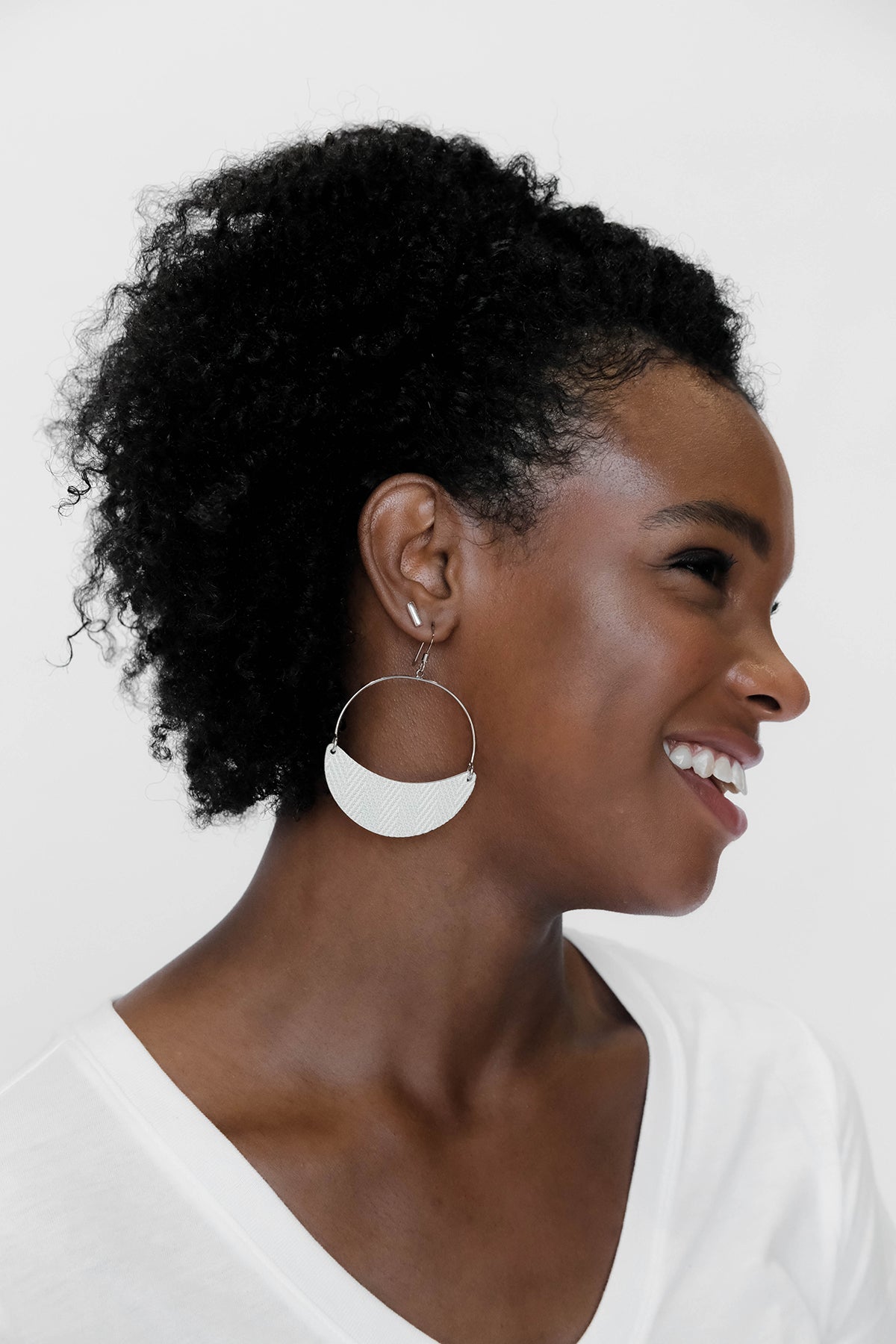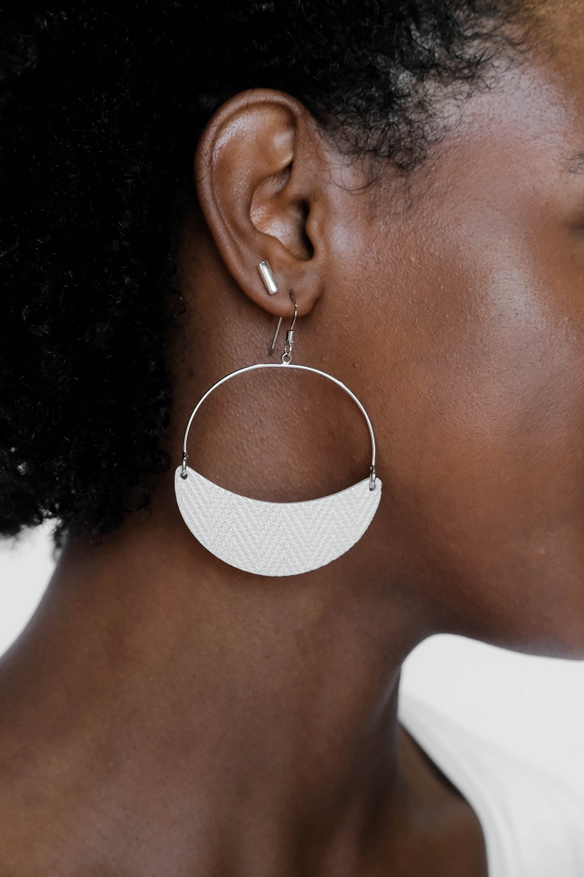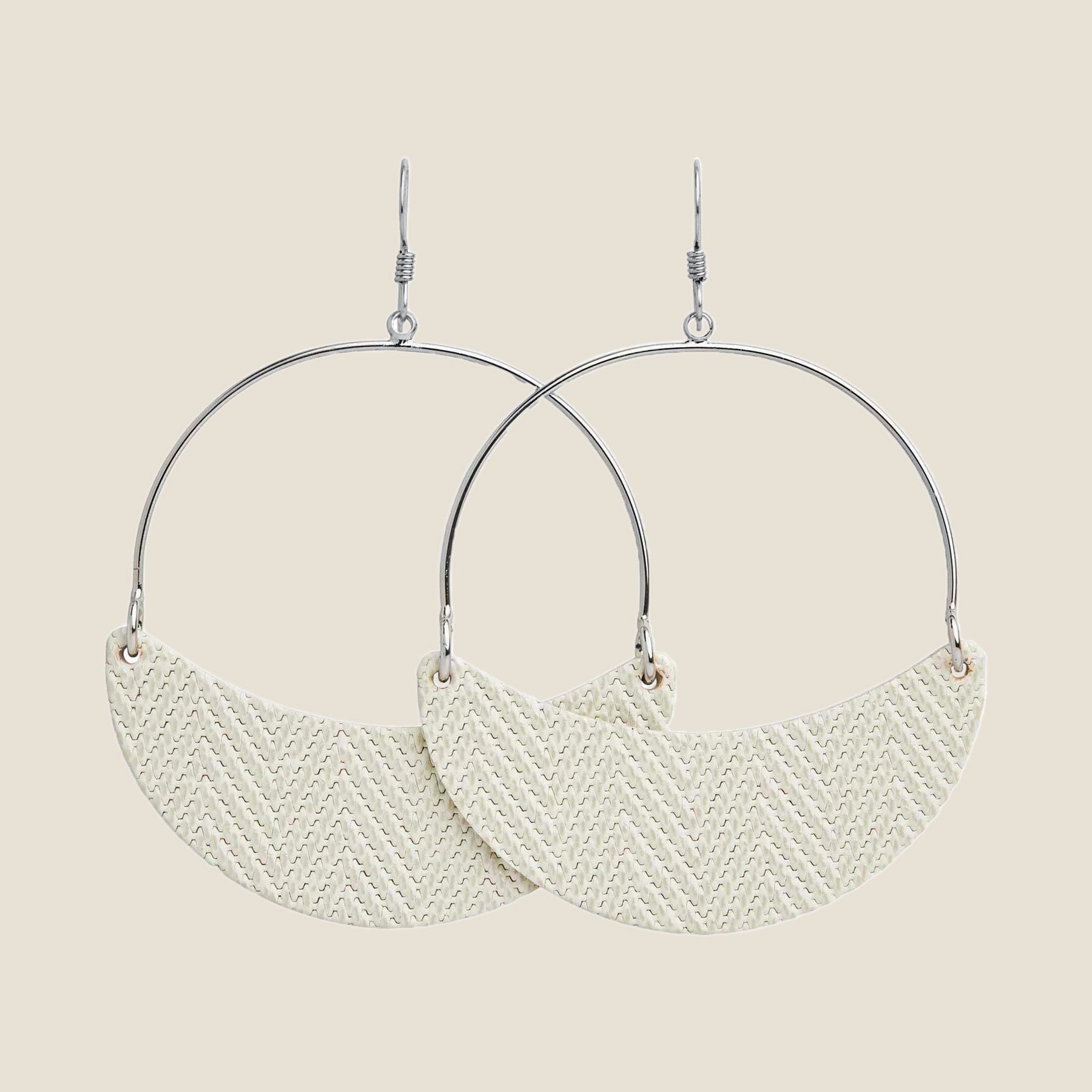 Asters are a lightweight take on the classic hoop earring with a crescent leather accent. This style is crafted from premium textured Soft Pearl leather, with a slight swinging movement and versatile wear-everywhere style.