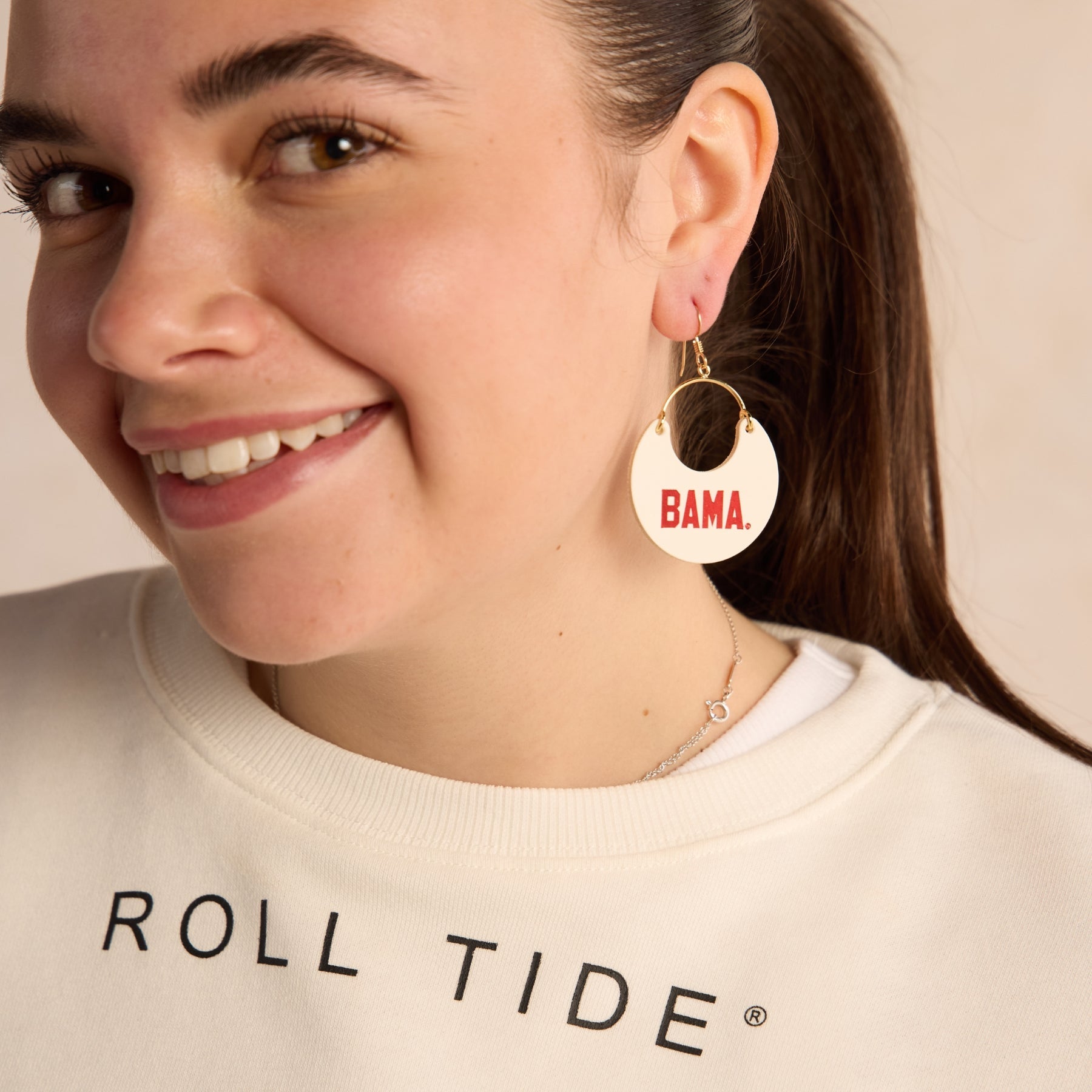 Elevate your game day look with our White University of Alabama BAMA Nina earrings. A cute and chic game day earring that's perfect for showing off your team spirit in style.