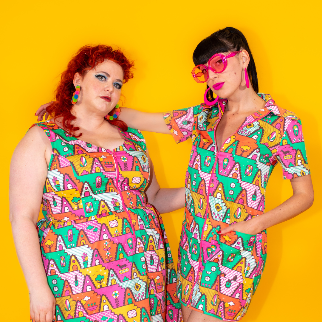 Meet our wildest fit & flare dress, made of stretch cotton poplin! Featuring our original, quirky print of geometric a-frame houses, bushes and trees, and little cute pets! These scoop neck dresses feature a bright front zip, POCKETS, and a neckline that looks flattering on all body types and isn't too revealing for work or too boring for a date!