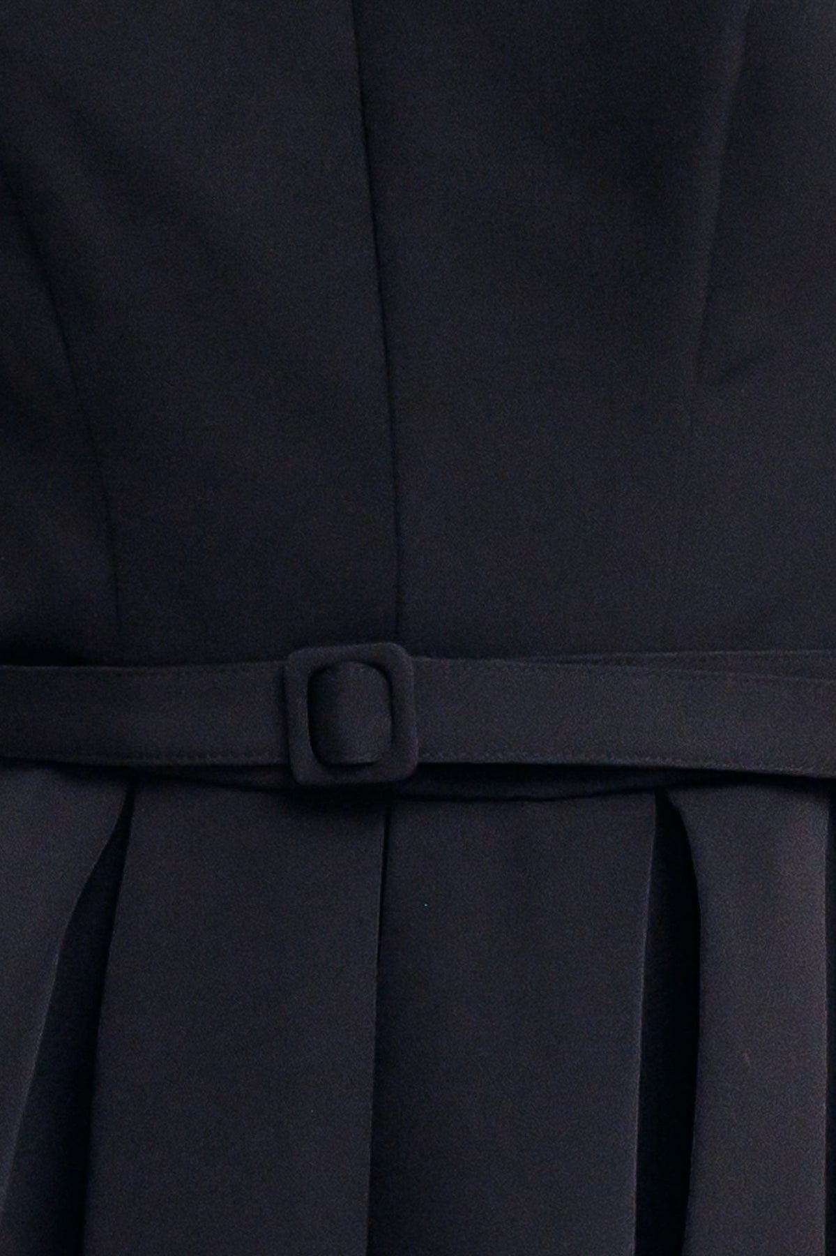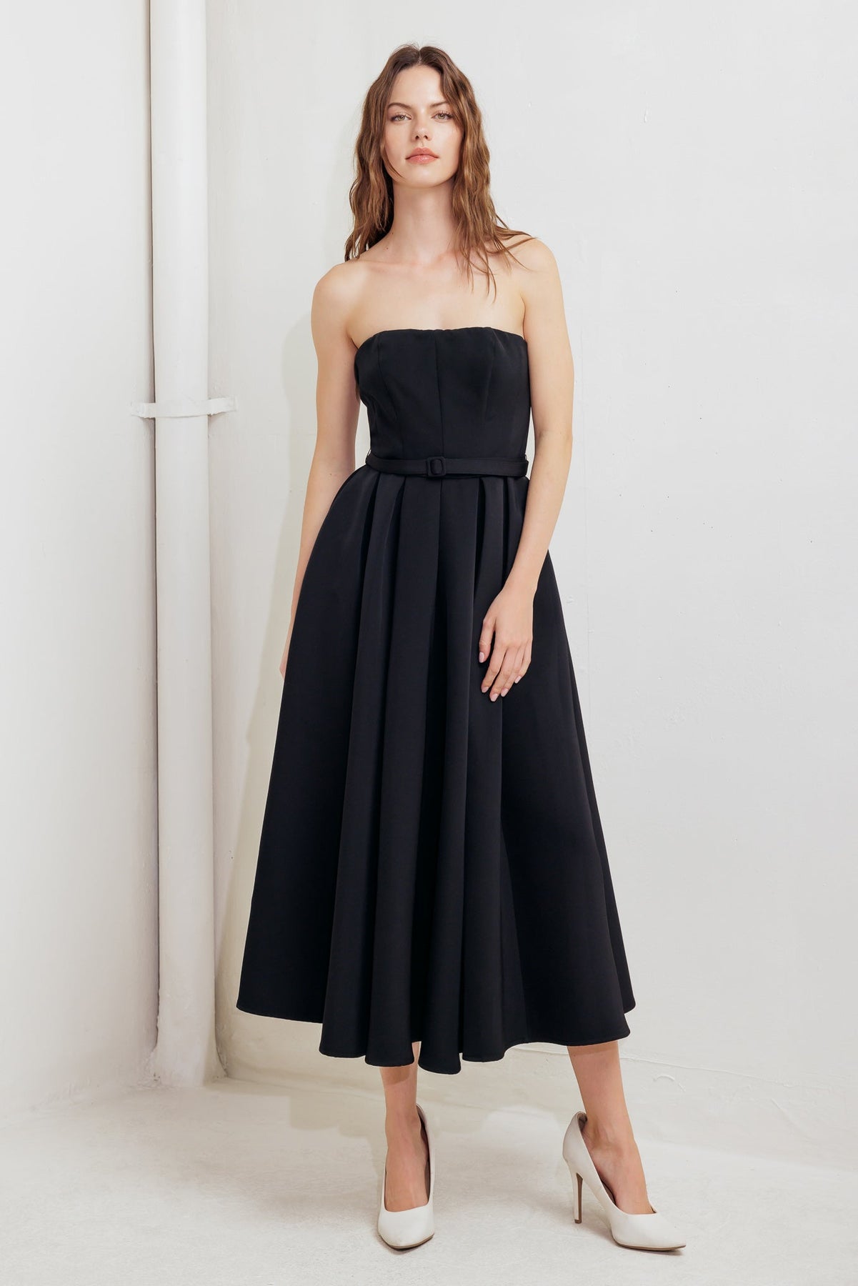A solid woven midi dress featuring strapless straight neckline, self belt, full skirt and back zipper closure