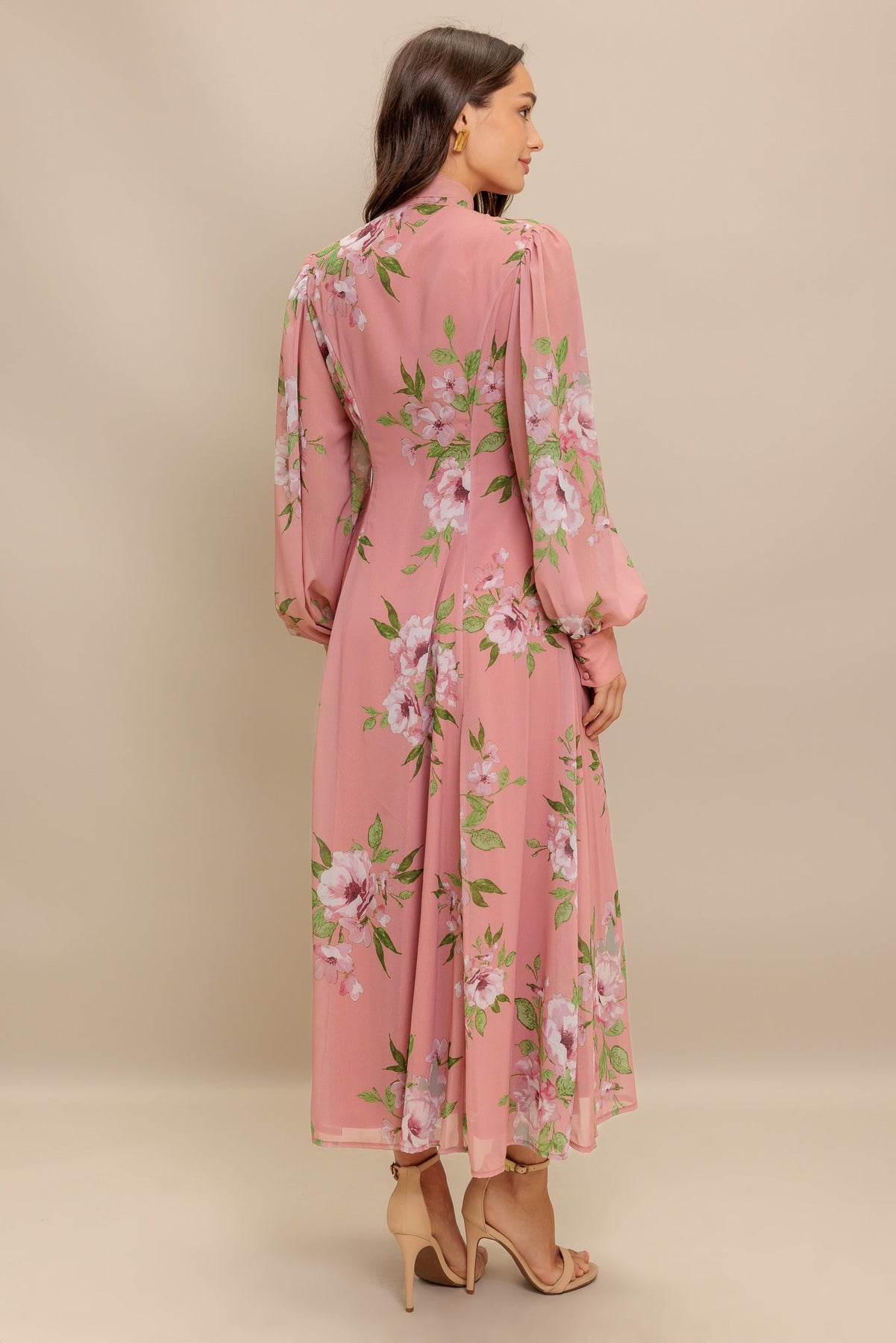 A printed woven midi dress featuring high neckline with bow tie, short puff sleeve with cuff, front button down and circle skirt