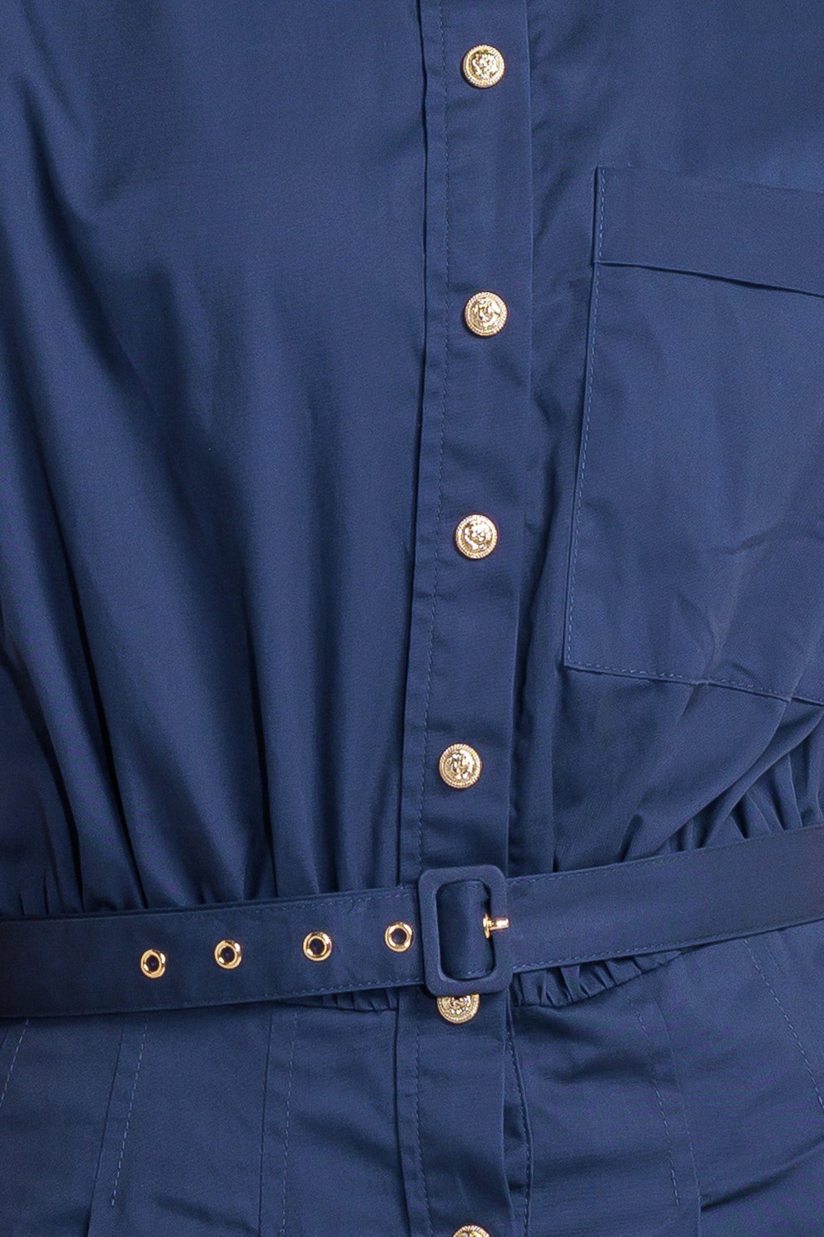A solid woven midi dress featuring collar, short sleeve, front pocket, button down, self belt and full skirt