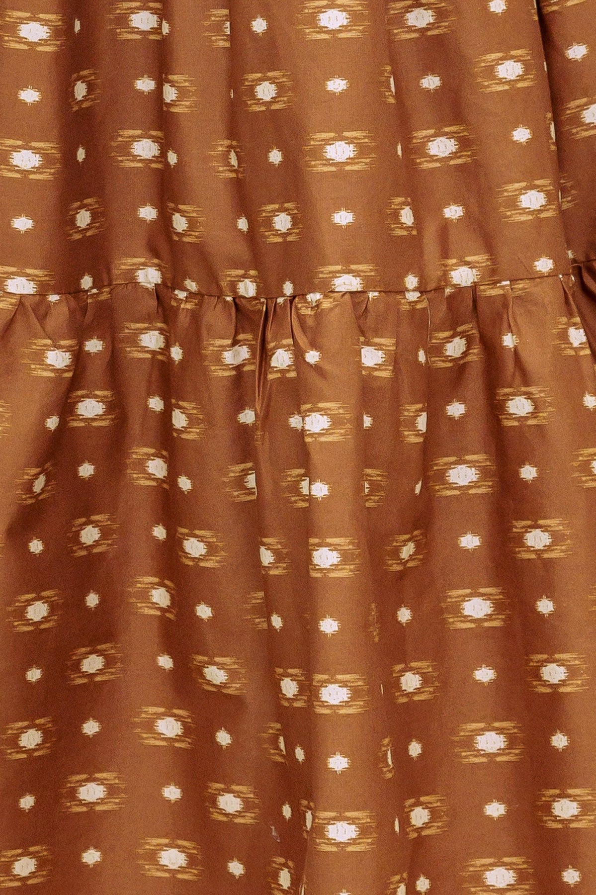 A printed woven midi dress featuring round neckline, long sleeve, elasticized waist with self sash tie, tiered skirt and back button closure