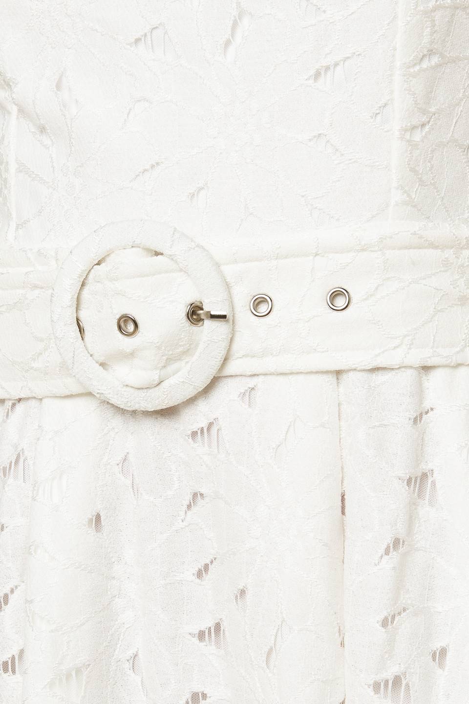 A woven lace midi dress featuring square neckline, sleeveless, self belt, full skirt and back zipper closure