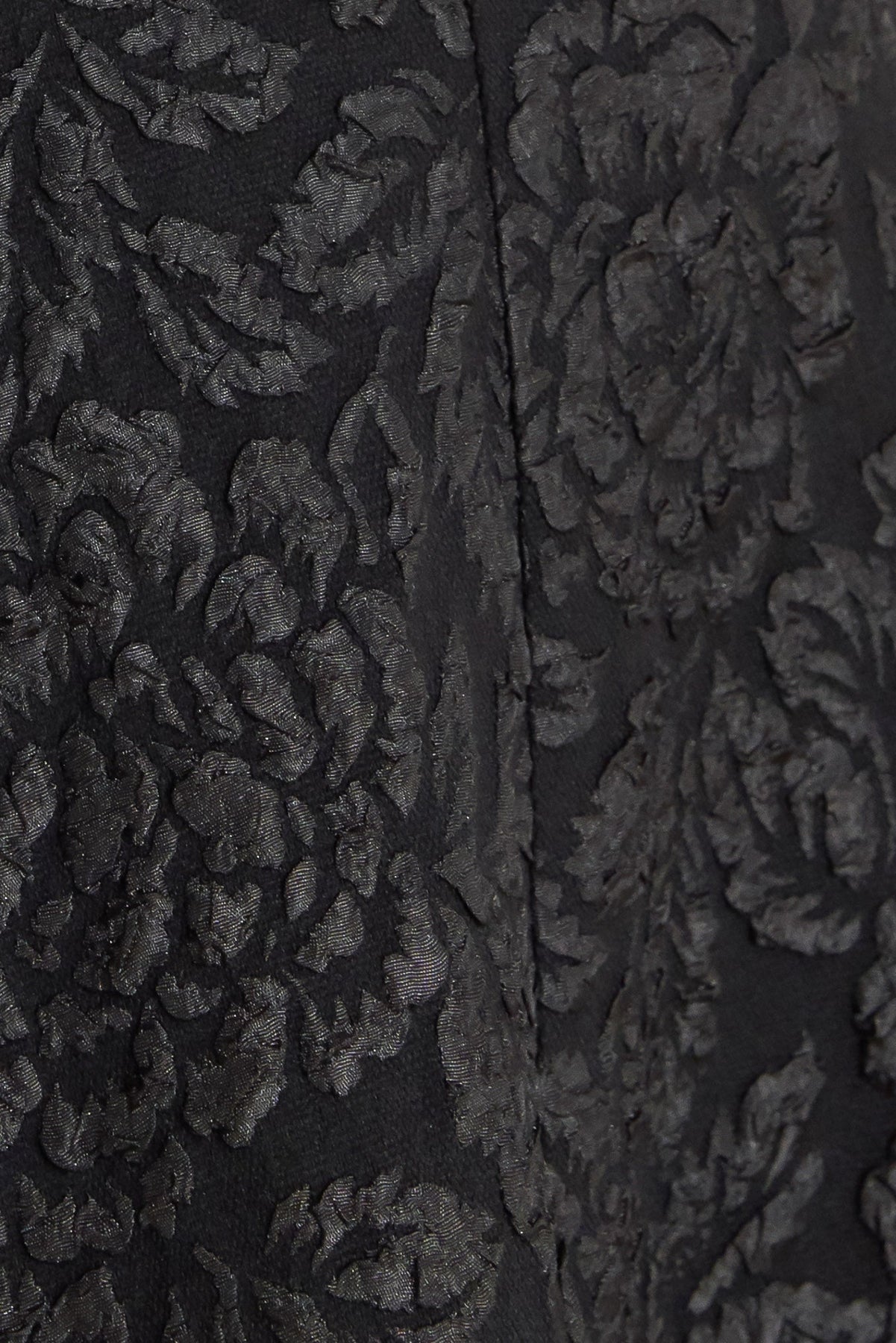 A jacquard woven midi dress featuring V neckline, sleeveless with back strap, circle skirt and back zipper closure
