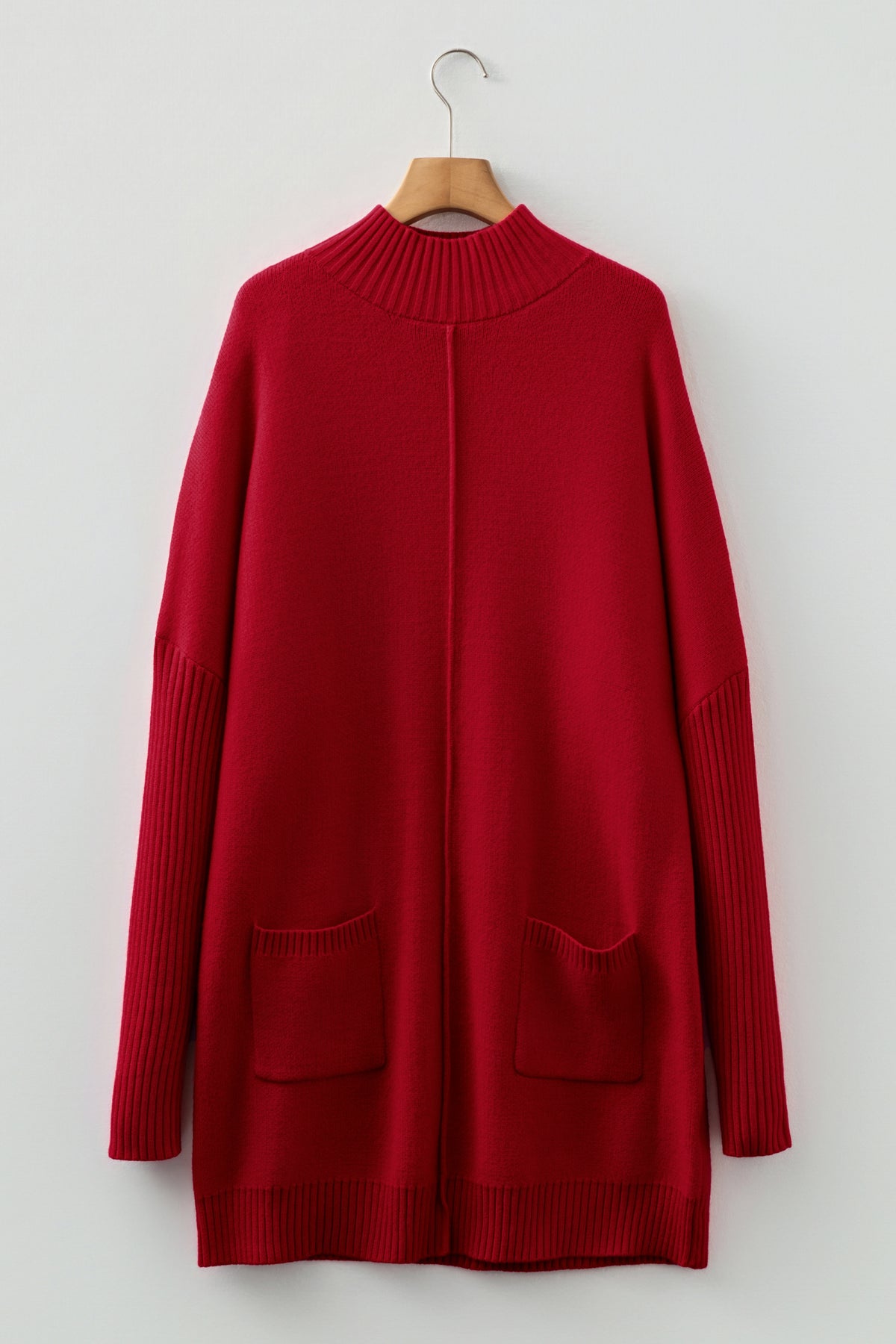 Fiery Red Ribbed High Neck Front Pockets Center Seam Shift Sweater Dress
