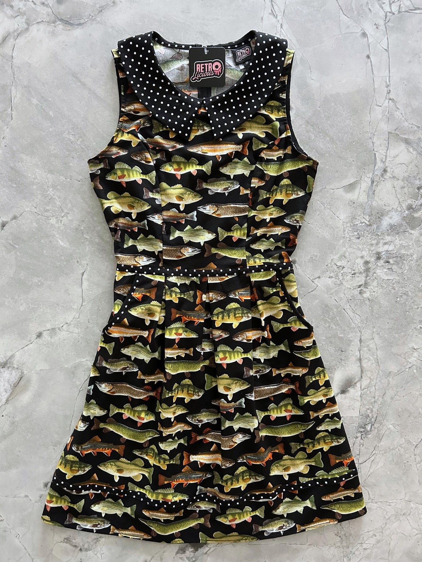 Fun and totally functional, this retro dress is bound to be your new favorite!  Shown in our Fish print, this 60s style cotton dress features a contrast Peter Pan collar, contrast piping throughout, a-line skirt with side pockets, and a back zippered closure.