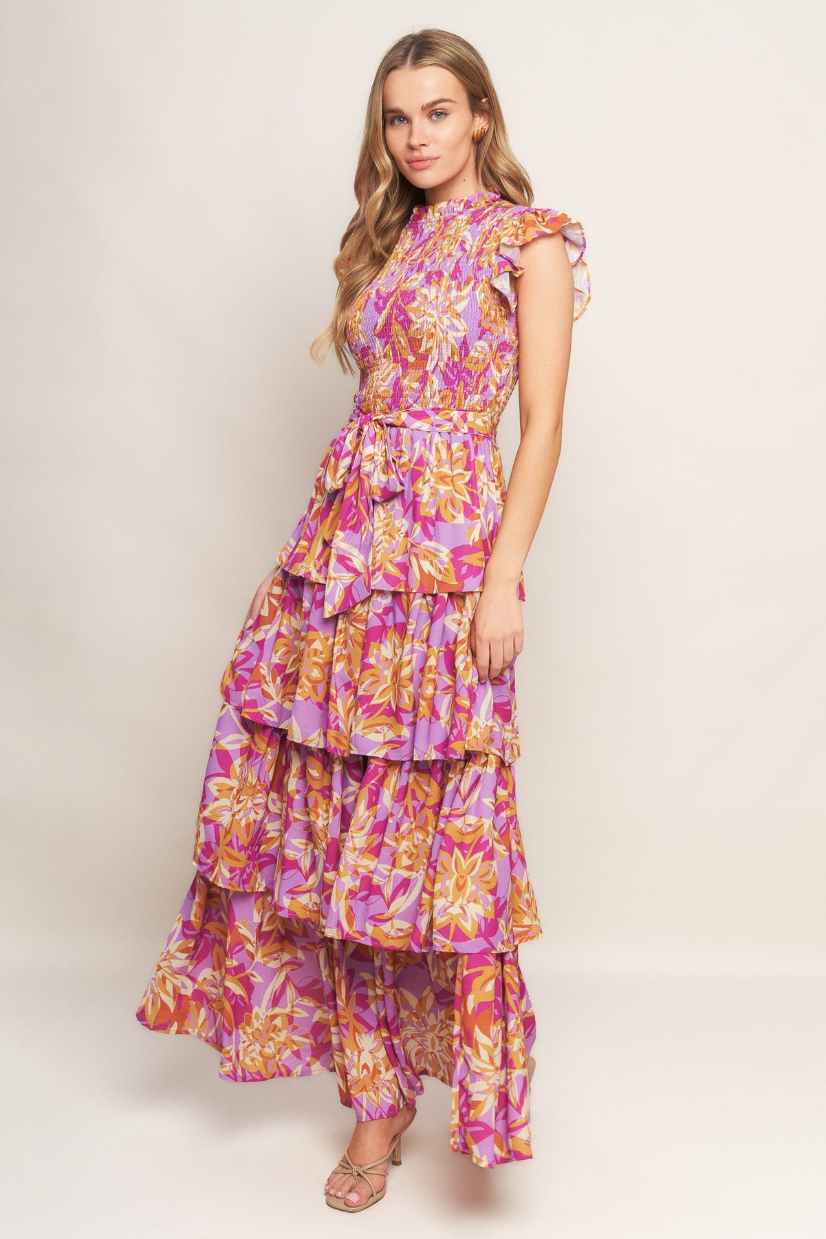 A printed woven midi dress featuring ruffled neckline, sleeveless with ruffled edge, smocked bodice, self belt, layered skirt and back neck button closure