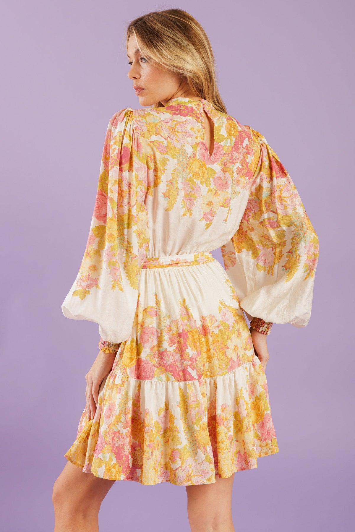 A printed woven mini dress featuring high neckline, long sleeve with smocked cuff, elasticized waist, ruffled hemline and back neck button closure.