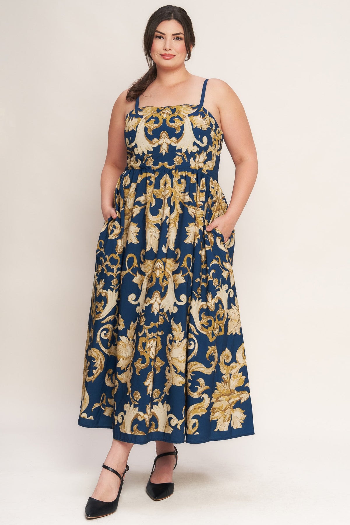 A printed woven midi dress featuring straight neckline, straps, circle skirt and back zipper closure