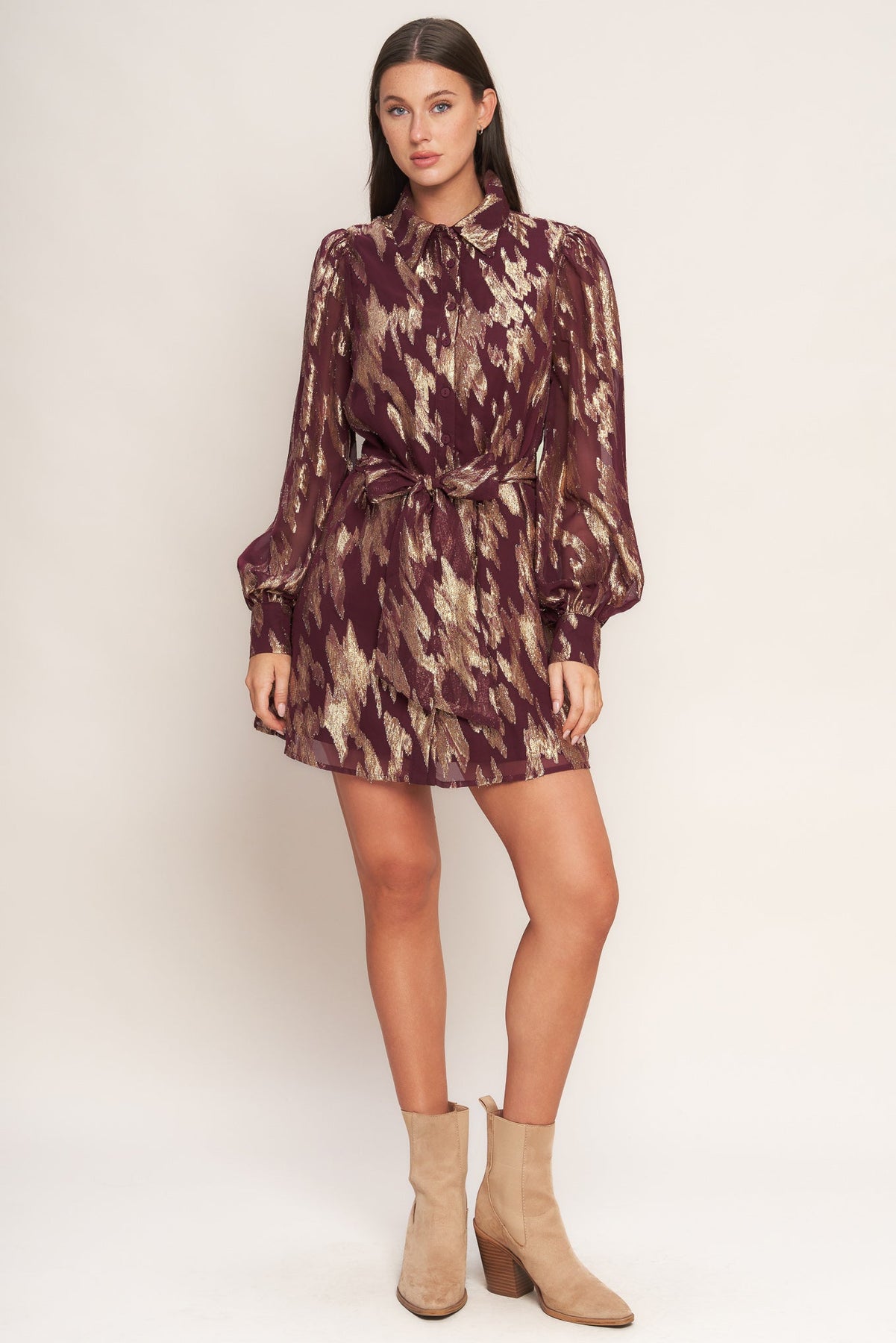 A metallic threaded woven mini dress featuring collar, bow tie, front button down and long sleeve with cuff