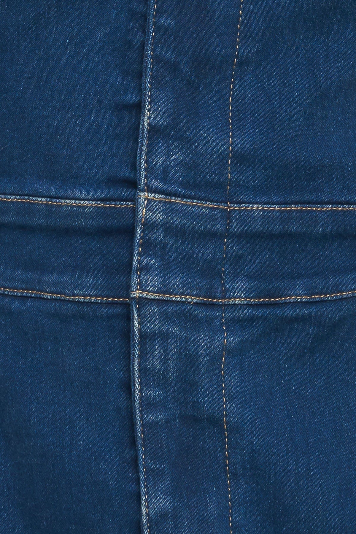 A washed denim midi dress featuring collar, hidden front zipper closure, long sleeve, front and side pockets with bottom front slit