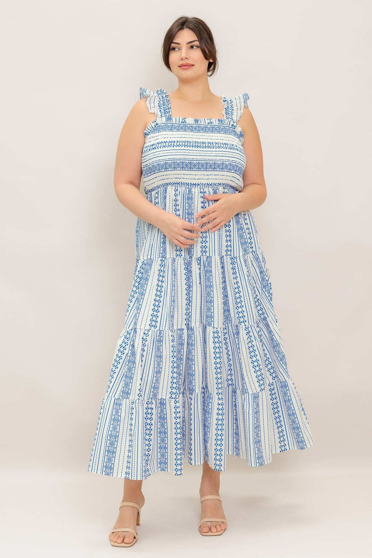 A printed woven midi dress featuring square neckline, ruffled sleeve, smocked bodice and tiered skirt.