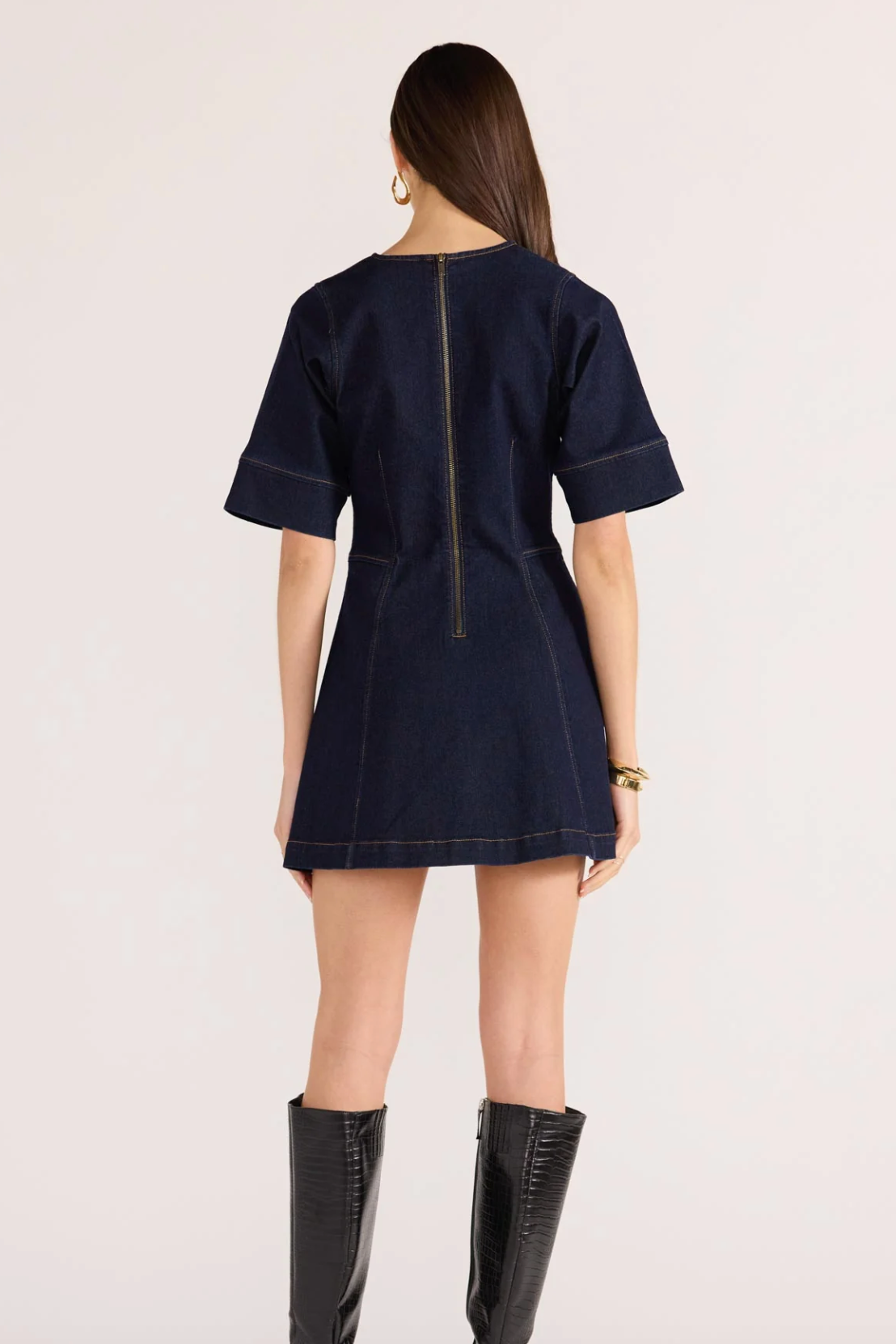 Structured, sculpted, and made to stand out — the Camilla Denim Panel Mini Dress by MINKPINK is a modern statement-maker in a midnight wash. Designed with wide sleeves, contoured panel seams, and a deep V neckline with keyhole detail, this mini blends classic denim with polished edge.