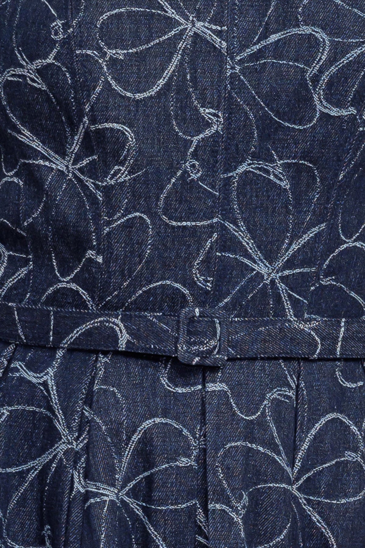 A denim midi dress featuring strapless straight neckline, self belt, full skirt and back zipper closure