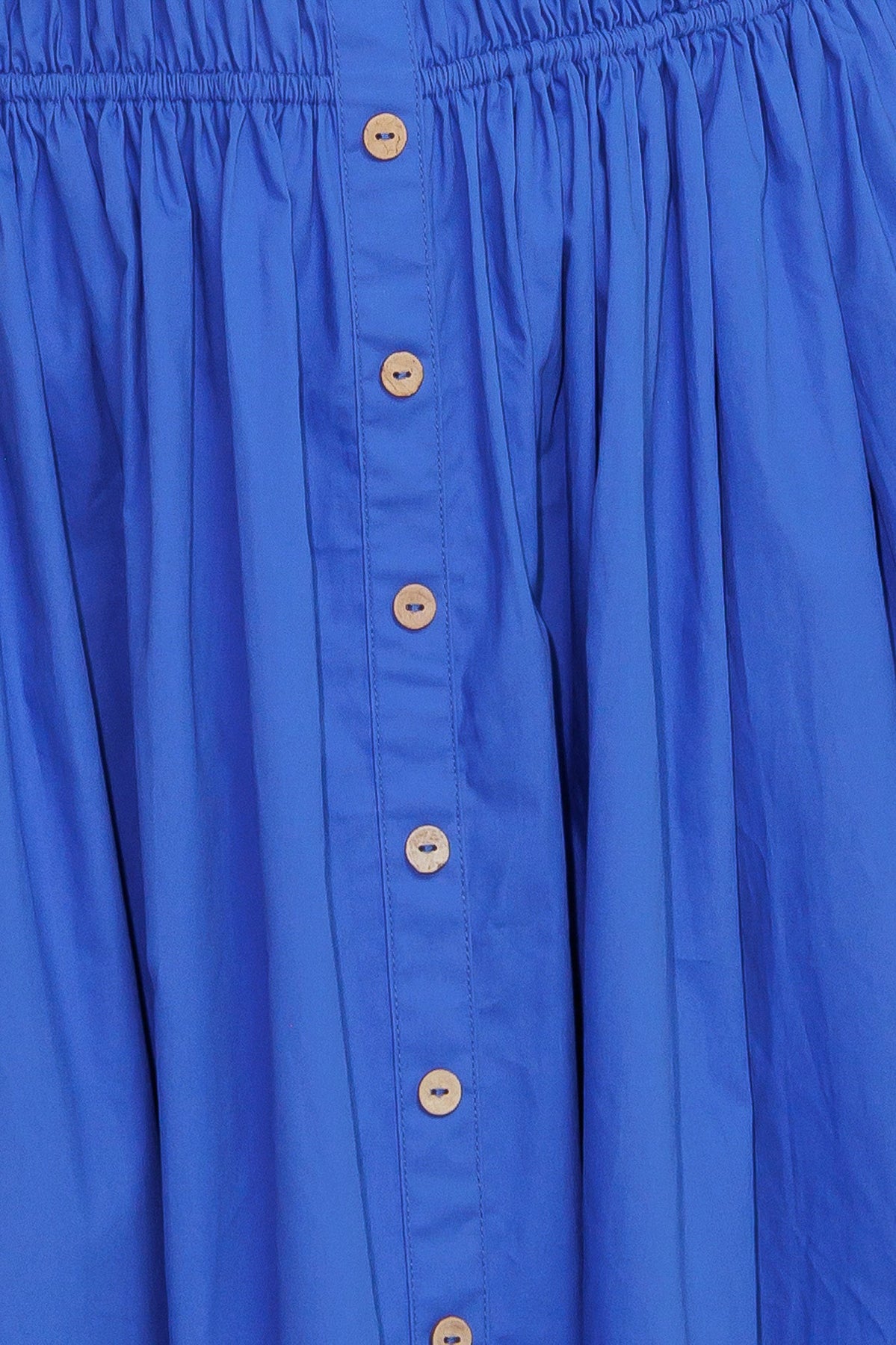 A solid blue woven midi dress featuring straight neckline, straps, button down detail and smocked bodice