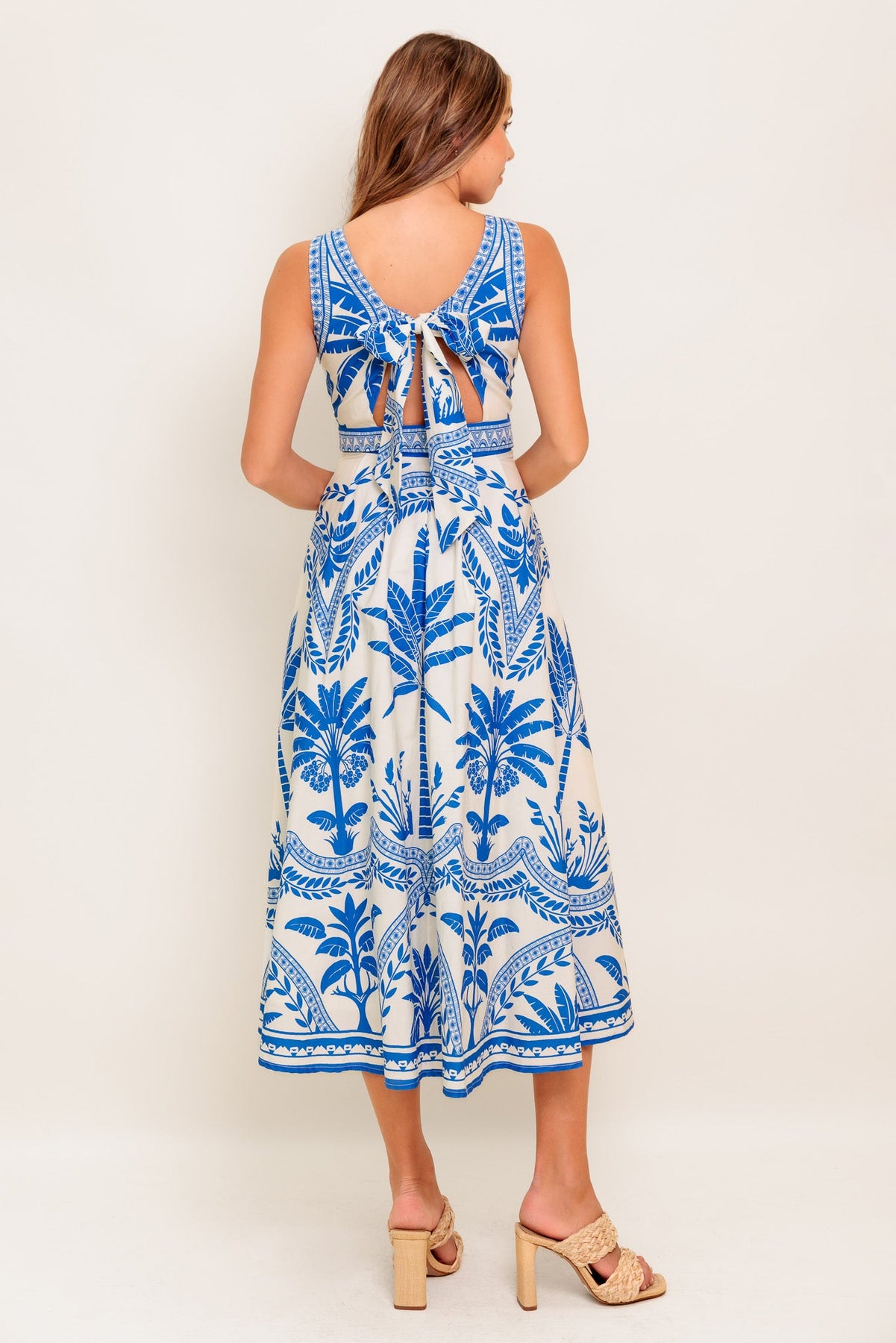 A printed woven midi dress featuring round neckline, sleeveless, circle skirt and tie back with zipper closure