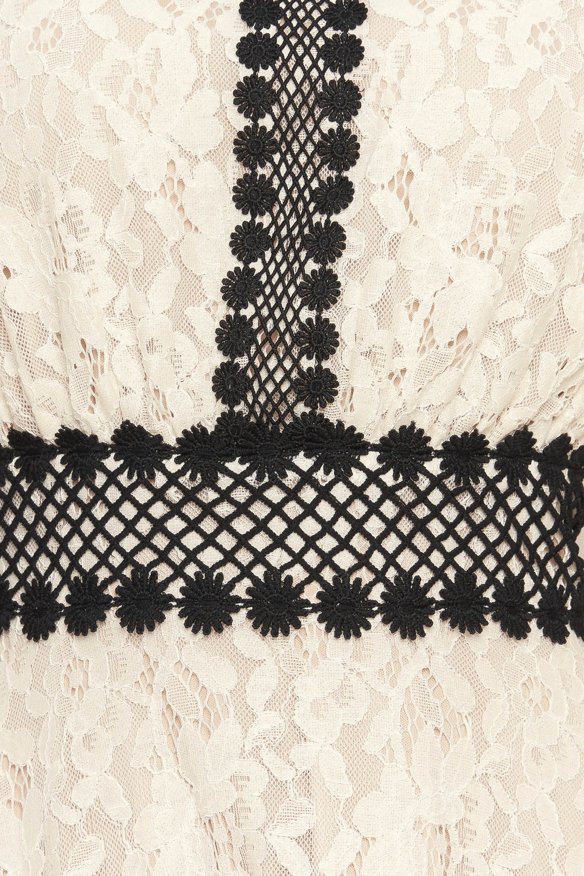 A solid woven lace midi dress featuring round neckline, lace inset detail, circle skirt and back zipper closure