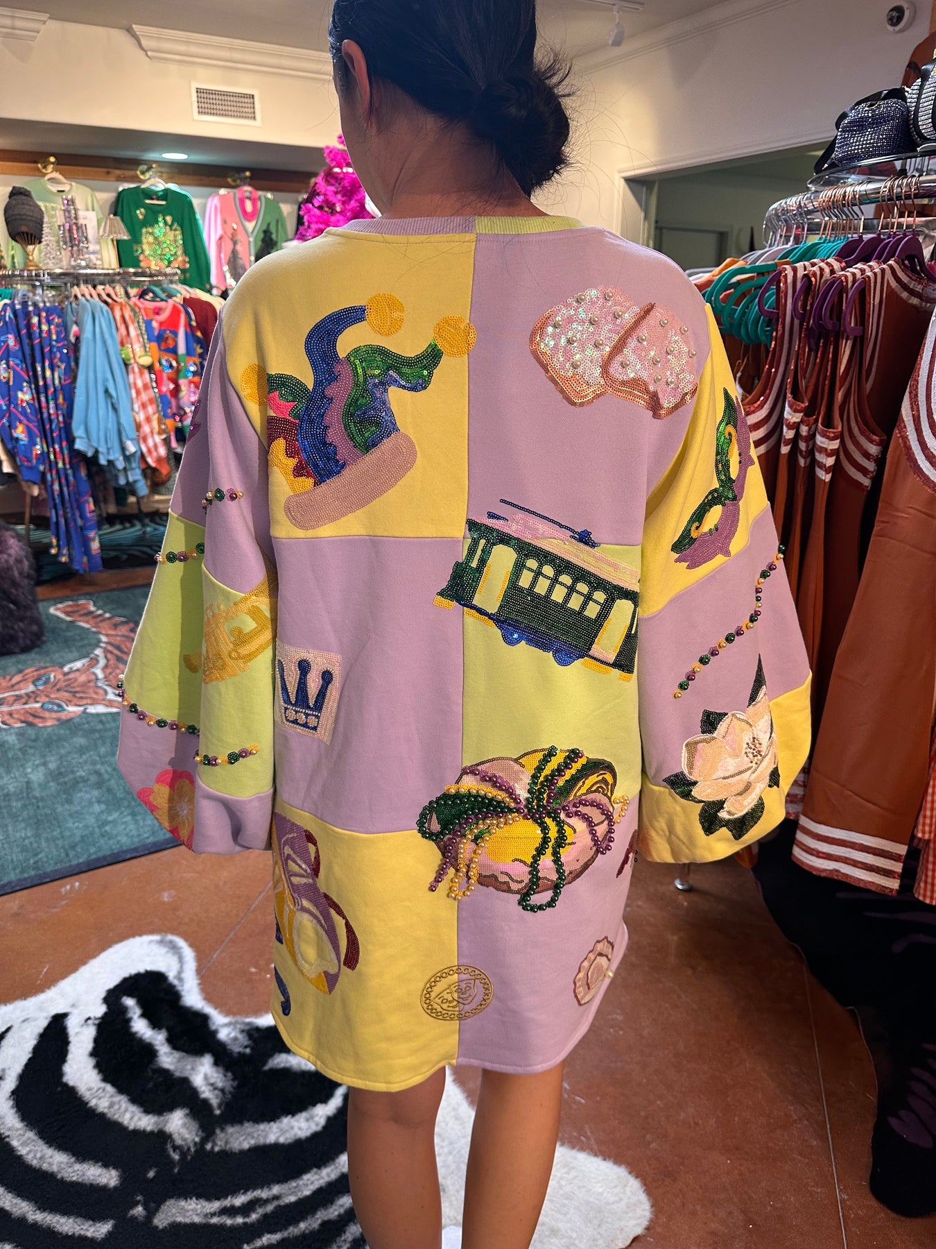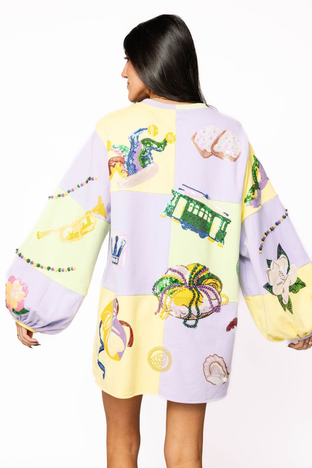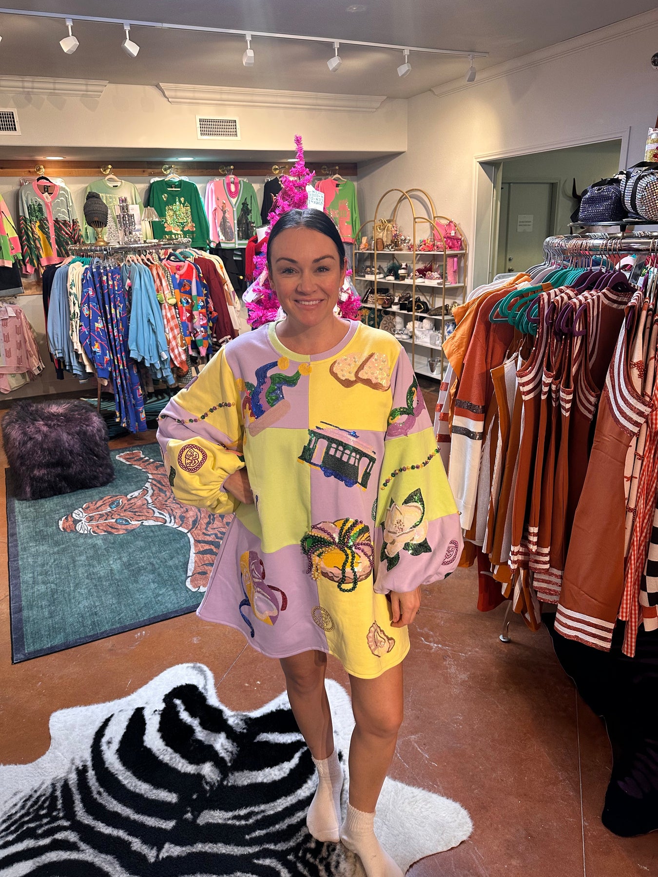 Introducing the Queen of Sparkles dress! This checkered Mardi Gras Icon dress features bold balloon sleeves that will make you stand out at any party. Perfect for showing off your festive spirit and unique style. Let the good times roll!