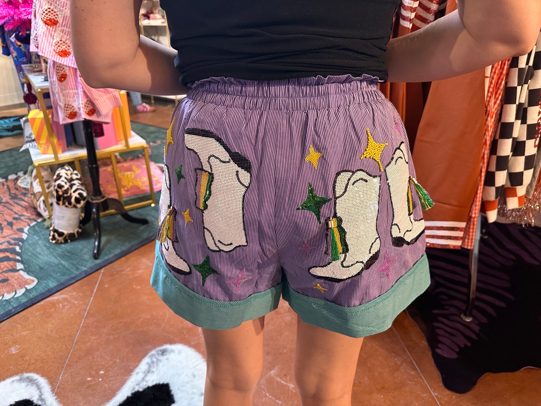 Get ready to party in these Queen of Sparkles boot shorts! With green and purple stripes and a colorblock design, you'll be the shining star of any Mardi Gras celebration. Let your inner queen shine and sparkle in these fun and playful shorts!