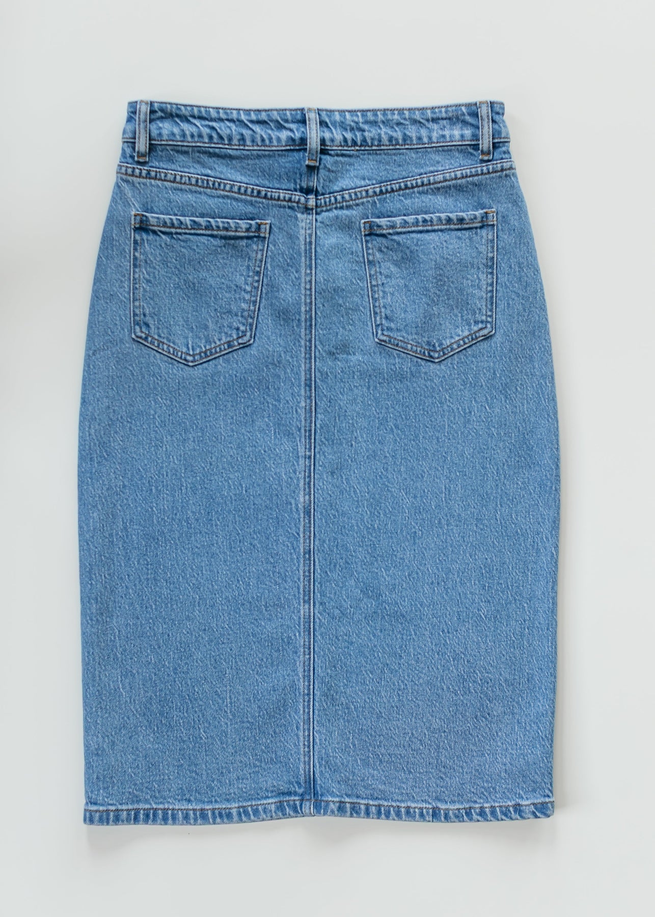 The Remi Denim Midi Skirt in Classic Wash offers a fresh take on a modest favorite, now available in 24" and 28" lengths for the perfect fit. Designed with a finished hem and no slit, this skirt features a flattering stretch denim that moves with you. Its timeless wash and tailored silhouette make it an everyday go-to you'll reach for again and again!
