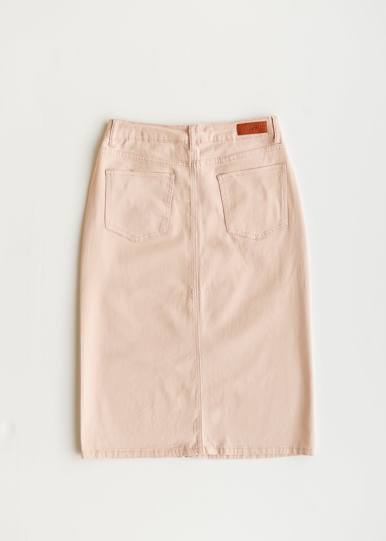 The Remi Denim Midi Skirt is a wardrobe must-have! An Inherit Design, this best-selling skirt offers a timeless, modest straight fit that pairs effortlessly with any outfit. Designed for all-day comfort, it features incredible stretch, ensuring ease of movement without the need for a back slit. The finished hem adds a polished touch, making it easy to dress up or down for any occasion. Available in two versatile lengths—26" and 29", this colored denim midi skirt provides the perfect amount of coverage while remaining stylish and flattering. Whether you're heading to church, running errands, or enjoying a casual day out, the Remi Midi Skirt will quickly become a go-to favorite in your closet. Style it with a cozy sweater for cooler months or a breezy blouse for a fresh, warm-weather look. Elevate your everyday wardrobe with this classic, comfortable, and effortlessly chic staple!