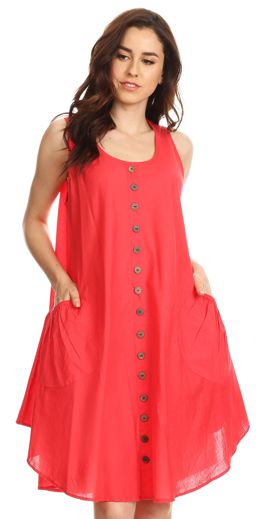 Simple easy to wear sleeveless dress, scoop neck, round pockets with elastic, decorative buttons at front, mid length. This casual dress flares from bust to hem, half circle hem. Lightweight fabric, solid color, drapes beautifully. An everyday day, easy to wear, easy to match. Wear it with bold bright jewelry! A must dress for this summer! Hand wash cold. Line dry. Imported| Material: 100% Cotton
