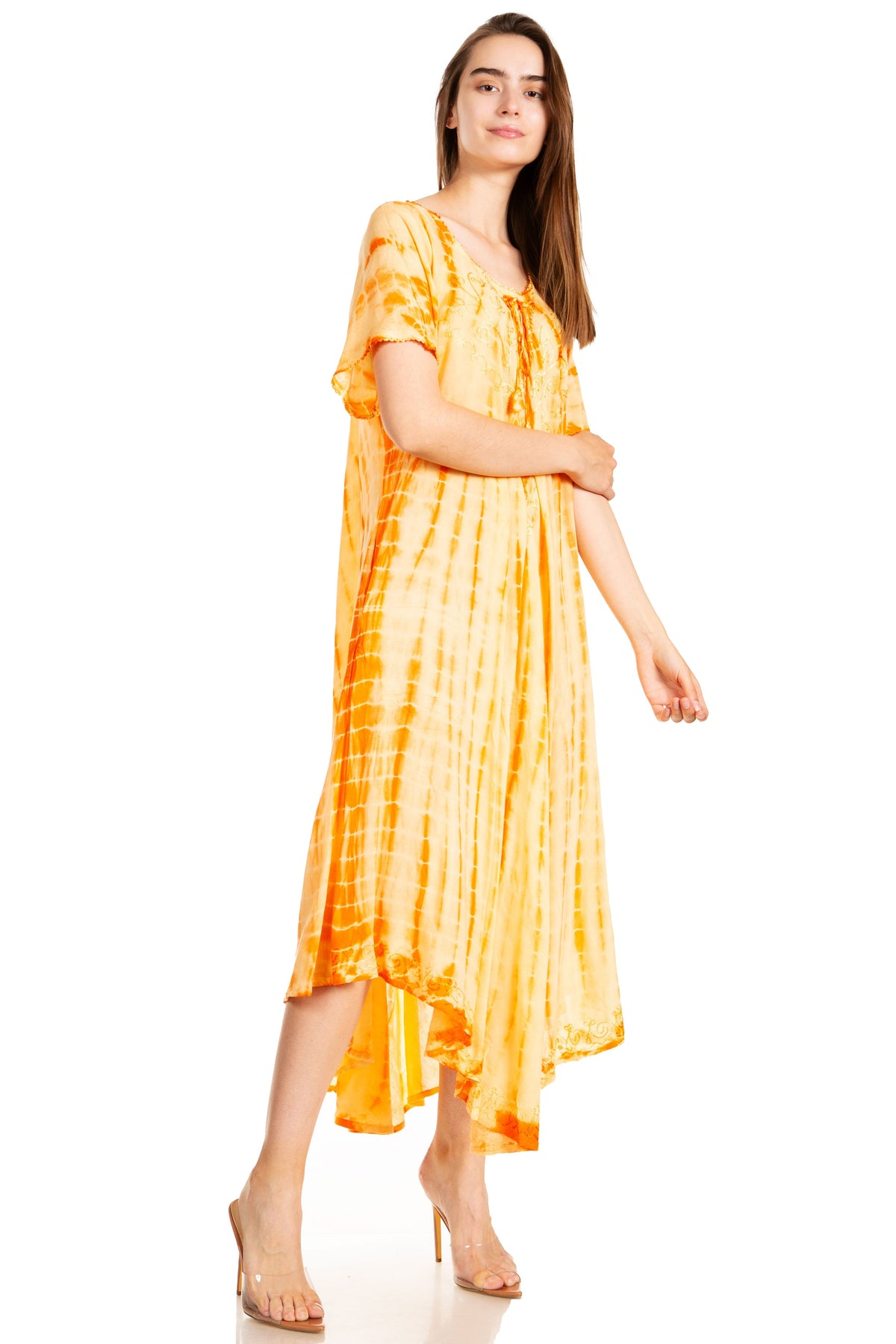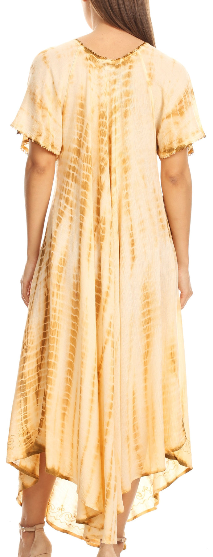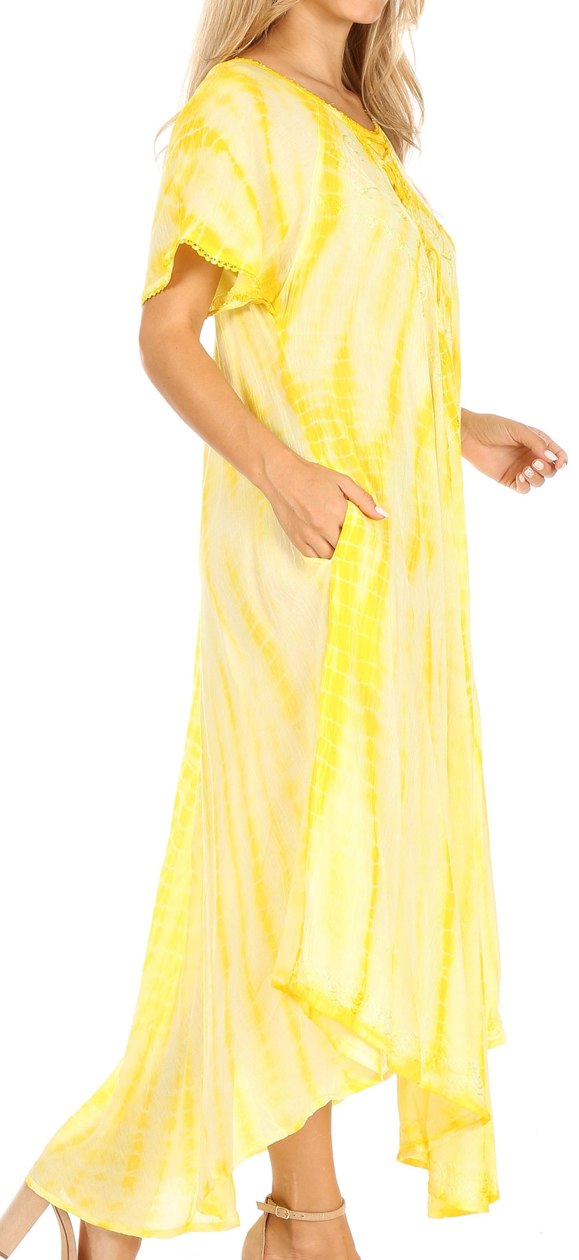 • Caftan dress features unique tie dye design, embroidered details, cap sleeves, lace up tie and relaxed fit.