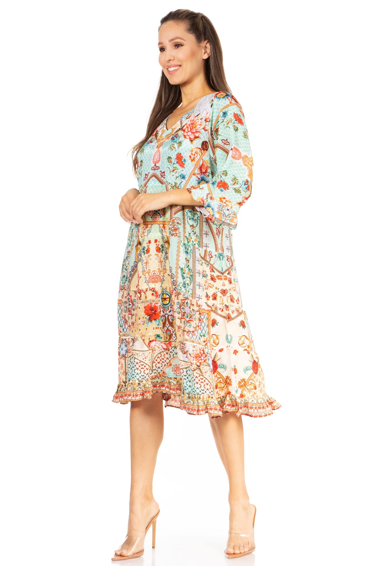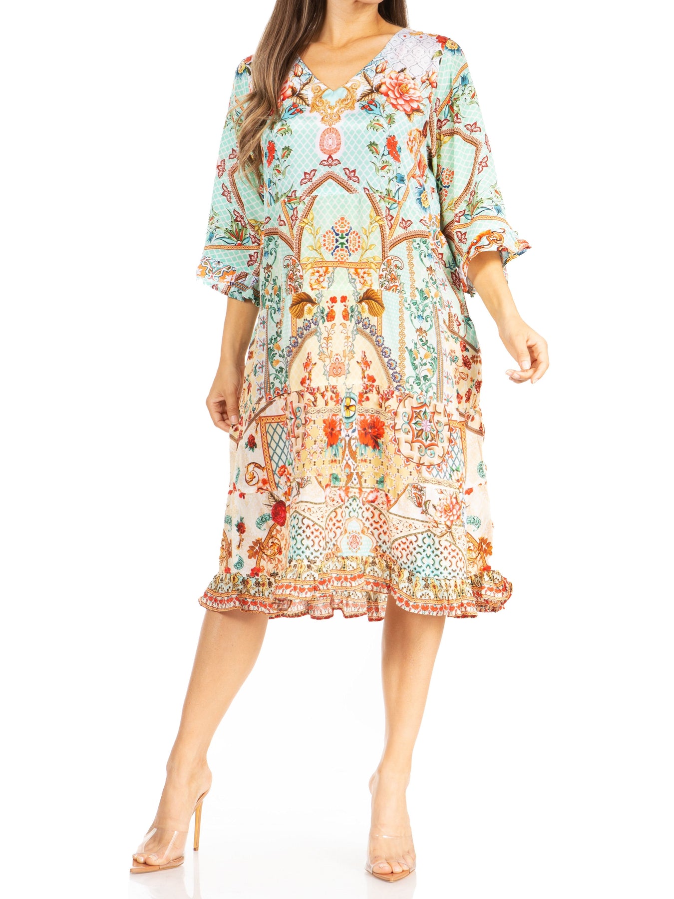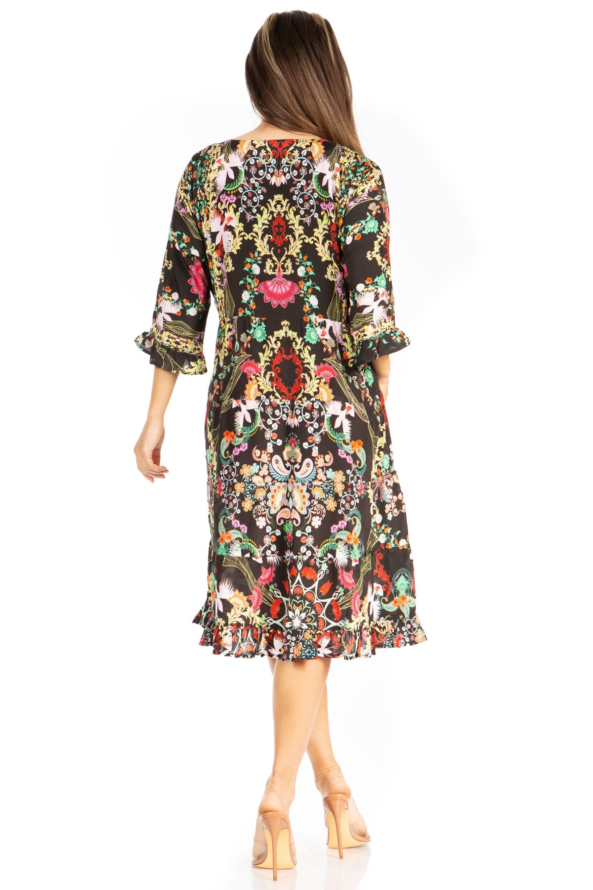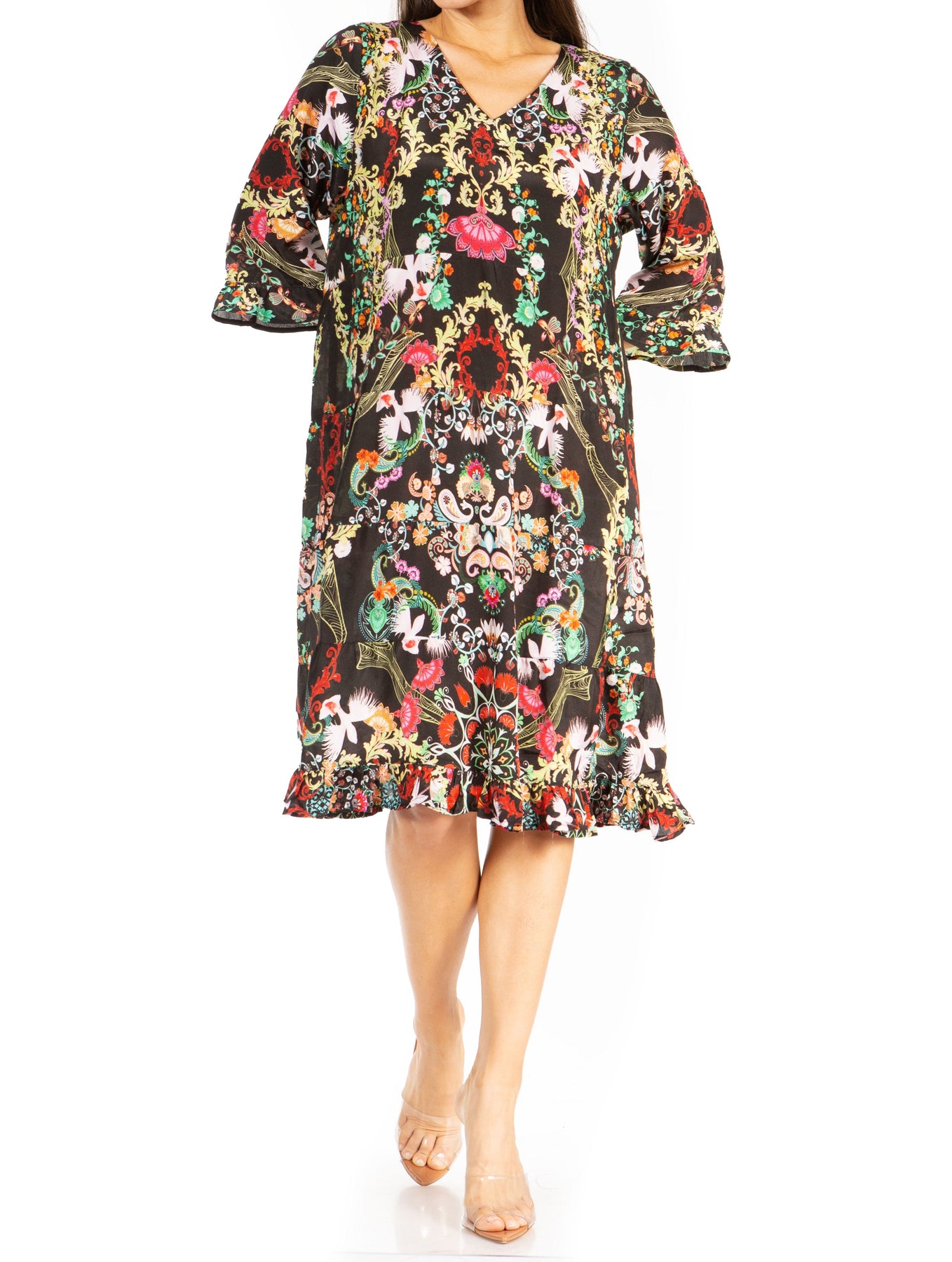 Ozana, the perfect everyday dress! Simple, versatile, flattering, and modest! Great for gatherings, events, and church. Midi length, comes with a V-neck, 3/4 sleeves, ruffle hem and cuffs, pull-over style. Made with lightweight material, finished with a vibrant print.