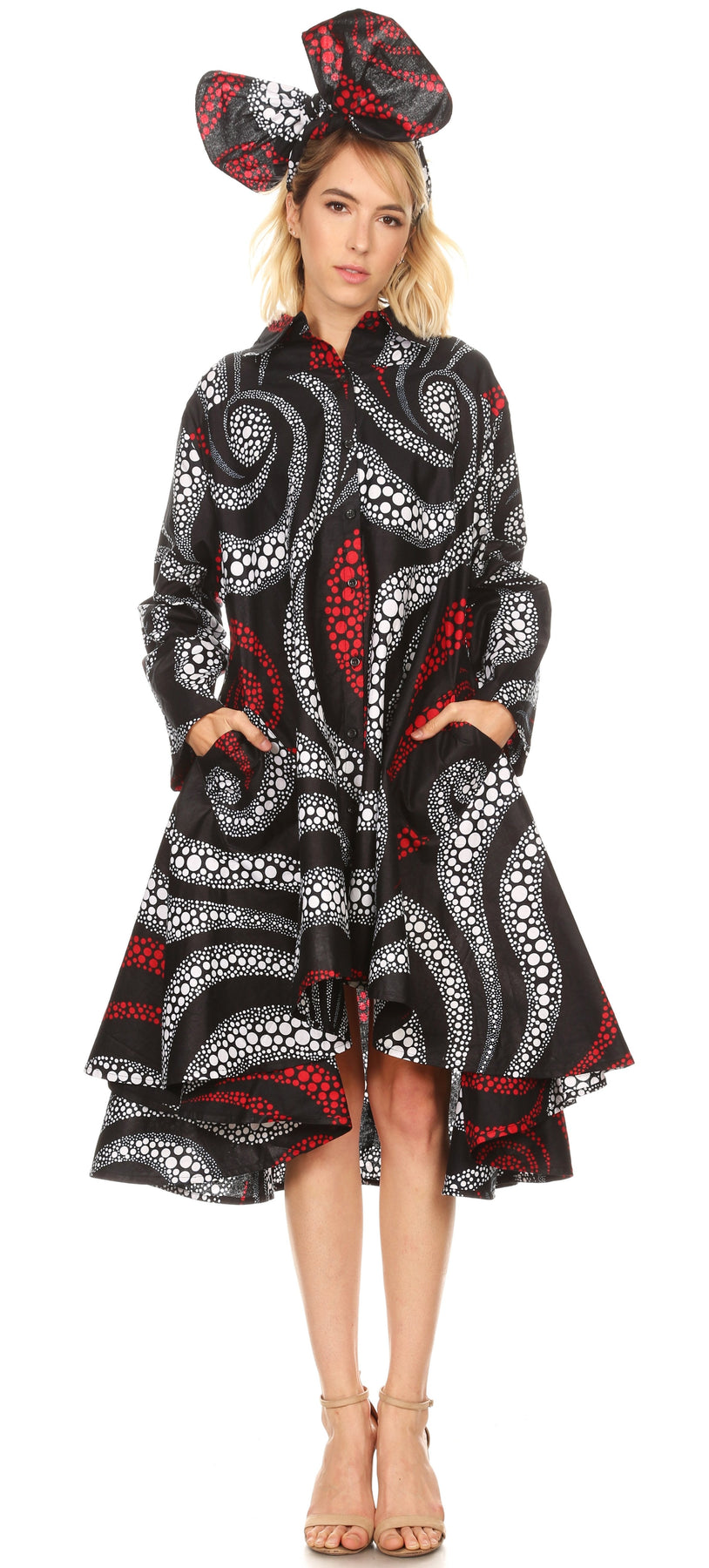 One Size Regular: Bust 44" (112 cm), Length 35" (89 cm). US 8-16W, EU 38-46, UK 12-20. Colorful Casual Statement: This stunning dress comes with lots of volume and unique details, shirt style with a full circle bottom, long sleeves, buttons down, comes with pockets. Unique high-low length. Sleeves can be rolled up, matching scarf included. Gorgeous print and a very forgiving style make this dress a must in every closet!