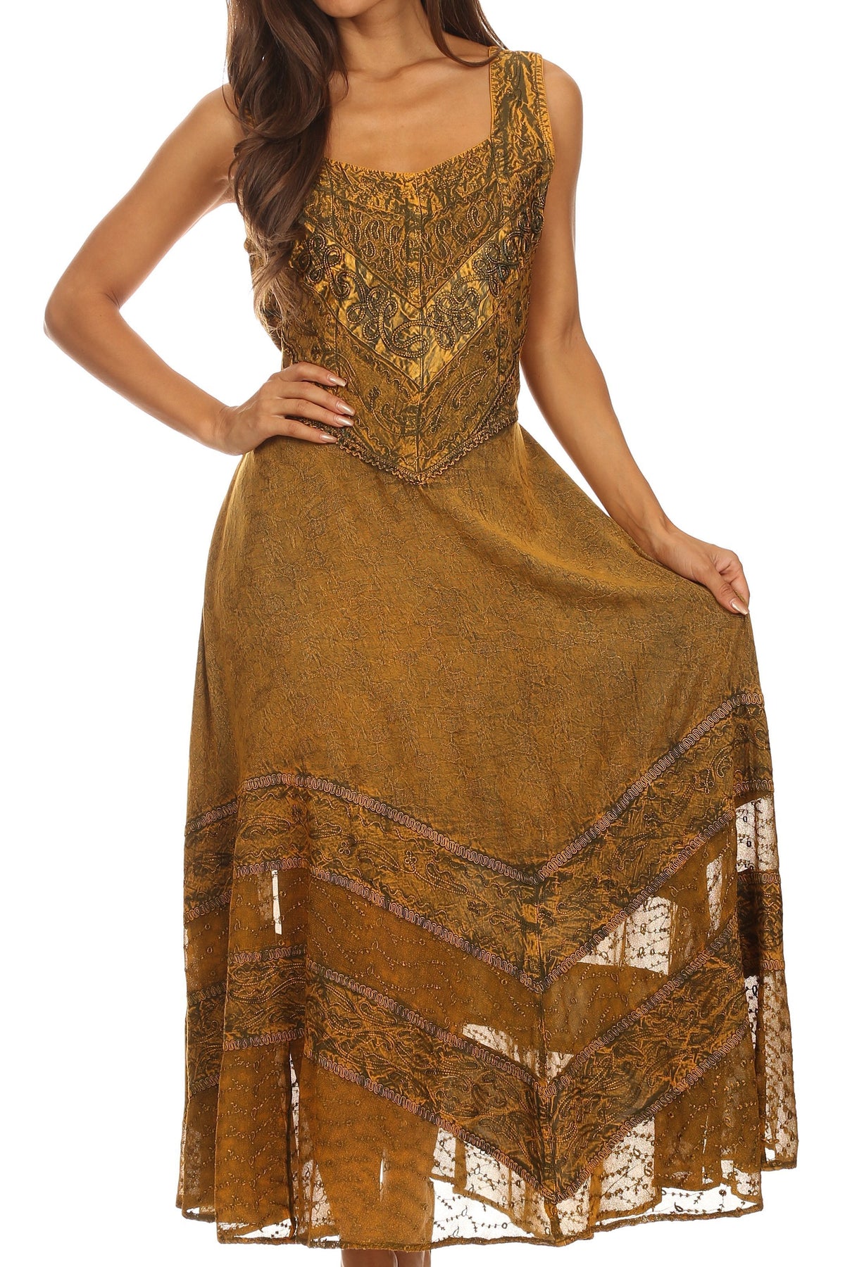 Sakkas Zendaya Stonewashed Rayon Embroidered Floral Vine Sleeveless V-neck Dress